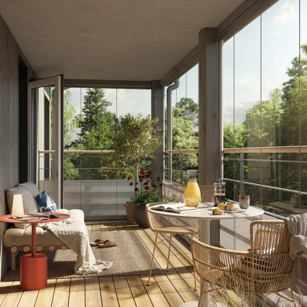 Alla bostäder erhåller dessutom egna inglasade balkonger, där de större lägenheterna i takvåningen till och med får två balkonger vardera.