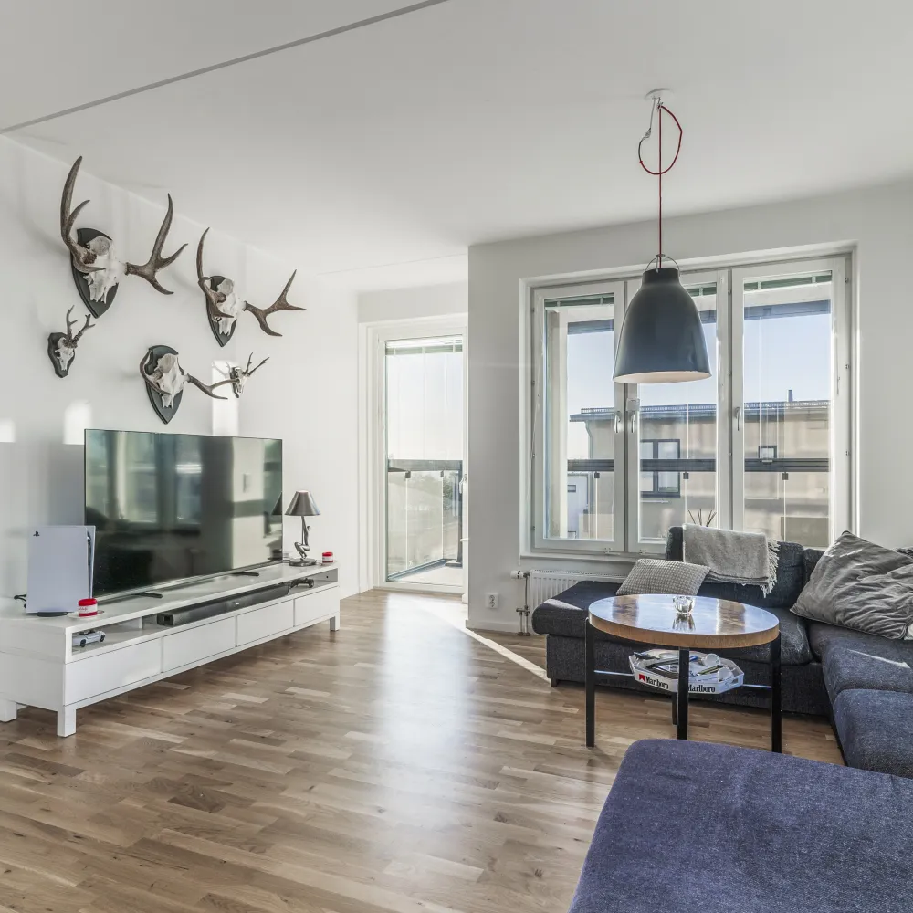 Lägenheten har en väldisponerad planlösning med entréhall med förvaring såväl bakom skjutdörrsgarderober med spegelglas samt i praktiskt förråd. Vardagsrum och kök är planerade som en öppen planlösning om över 30 m² med generösa fönsterpartier och med utgång till den trevliga balkongen i västerläge. Mot väster finns det mindre sovrummet vilket erbjuder en fin havsutsikt. Det större sovrummet är mycket rymligt och har ett svalt norrläge.