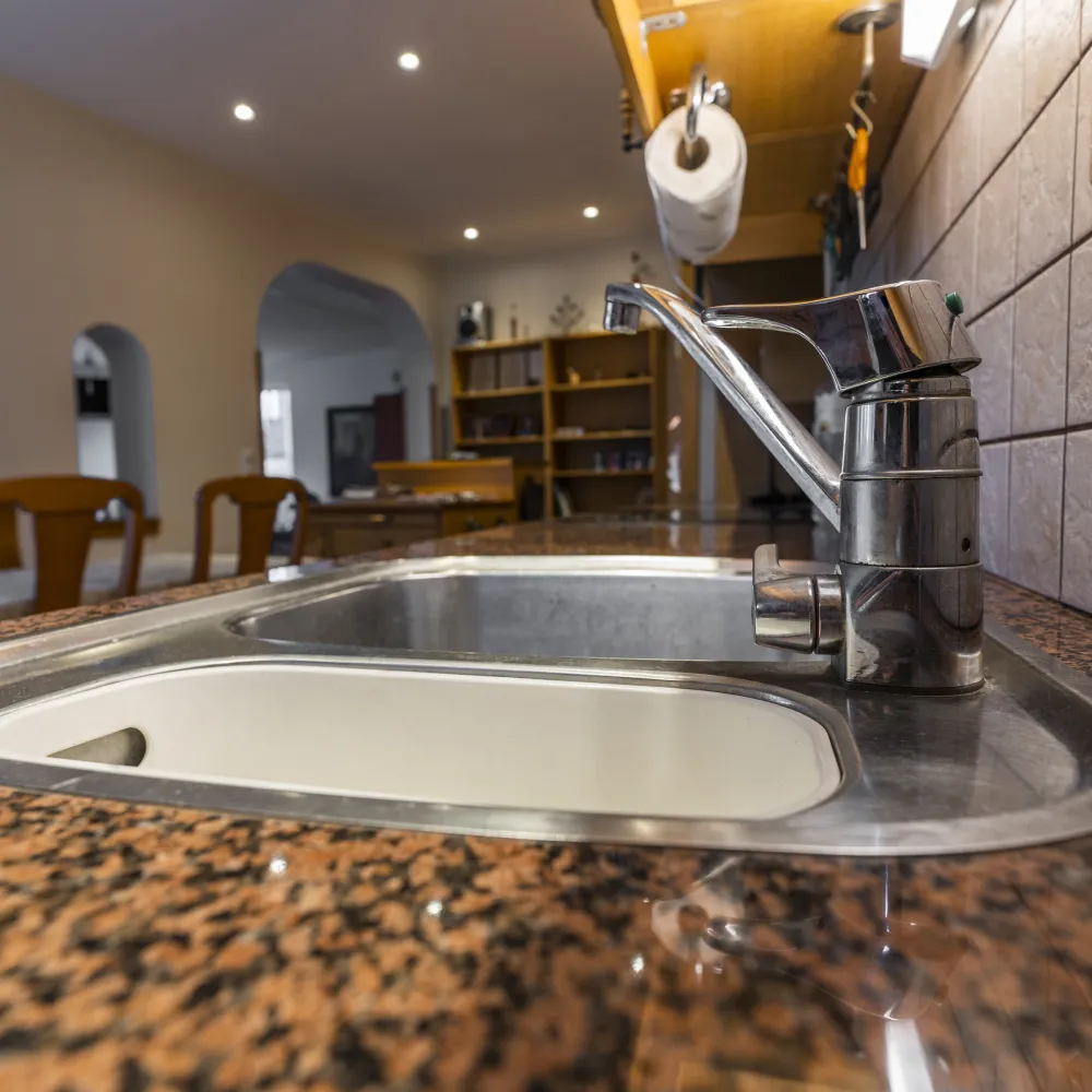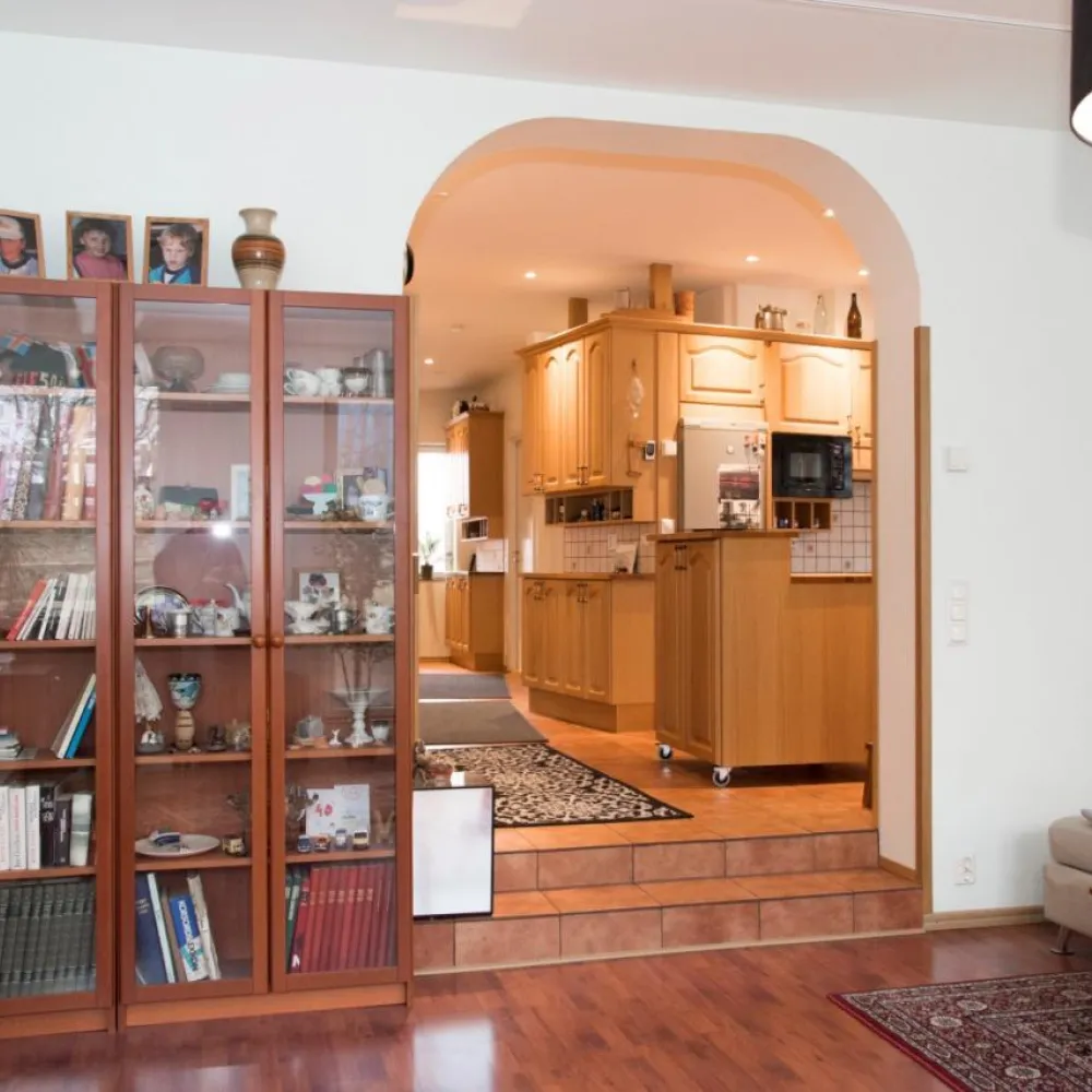 Vardagsrummet är nedsänkt i ett mindre etage och har laminatgolv. Fönsterbänkarna är klädda med stenskivor. Från vardagsrummet och köket finns flertalet dörrar ut till gården.