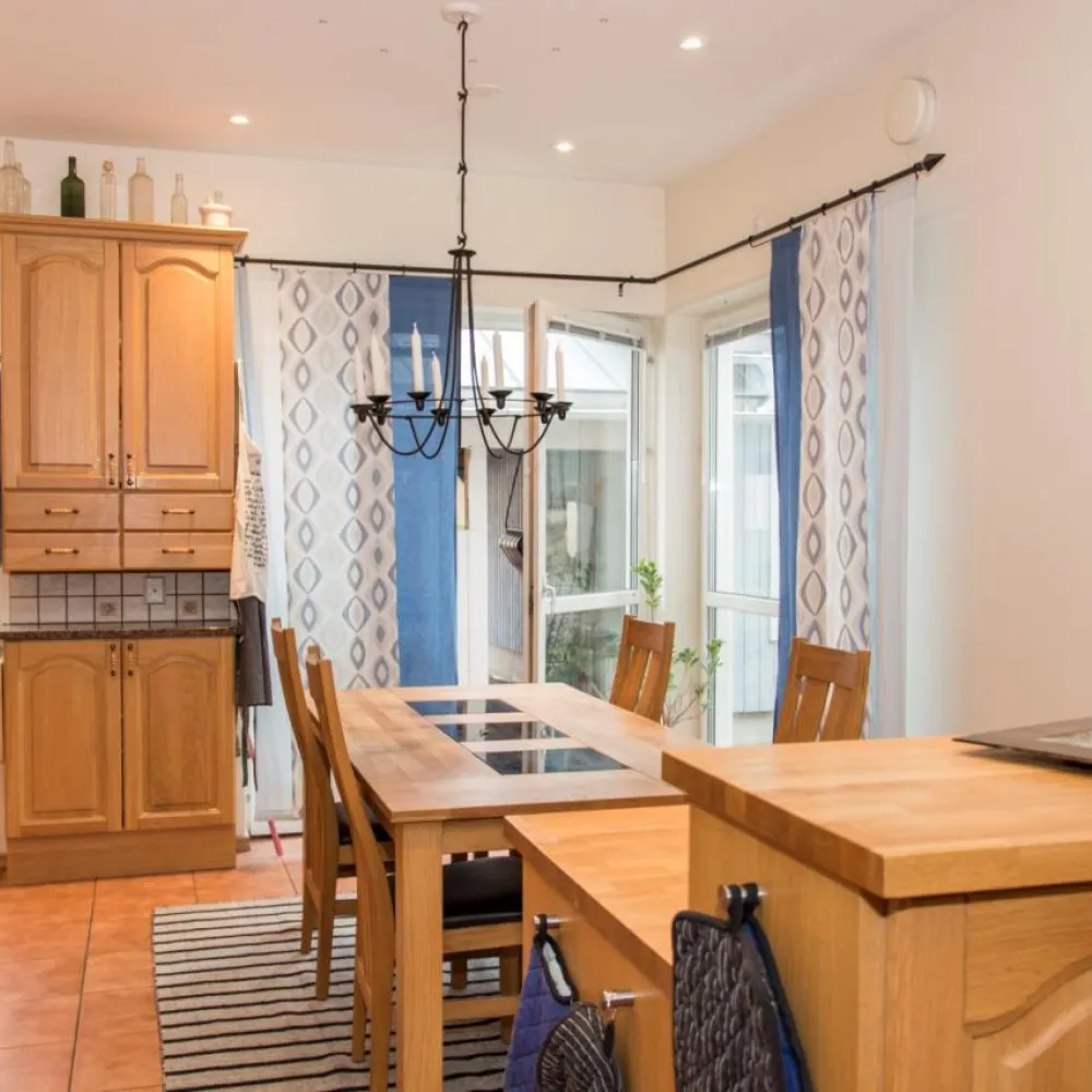 Köket är försett med skåpinredning i ek och bänkskivor i sten. Det är inrett med spis med keramikhäll, fläkt, inbyggd mikro, hel kyl och hel frys. Köksön är på hjul och har lådförvaring.