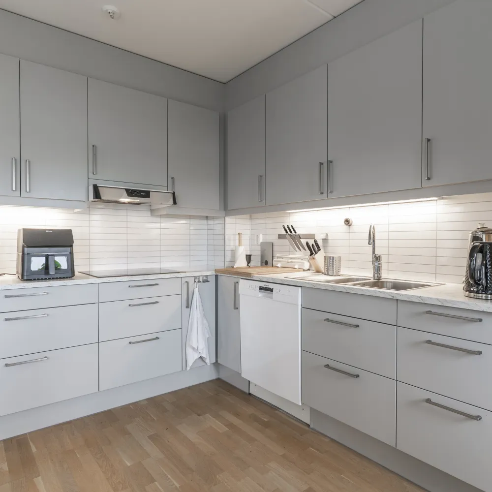 Köket är utrustat med kvalitetsvitvaror och gott om skåpinredning. Vitvarorna utgörs av kyl/frys, induktionshäll, fläkt, varmluftsung och mikrovågsugn i ergonomisk höjd samt diskmaskin. Köket inrymmer gott om utrymme för matplats.