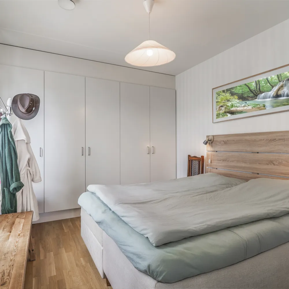 Sovrummet inrymmer förvaring i garderobsvägg med fem garderober samt plats för dubbelsäng.