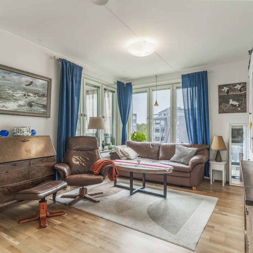 Vardagsrummet ansluter genom en halvöppen planlösning till köket och har access till den