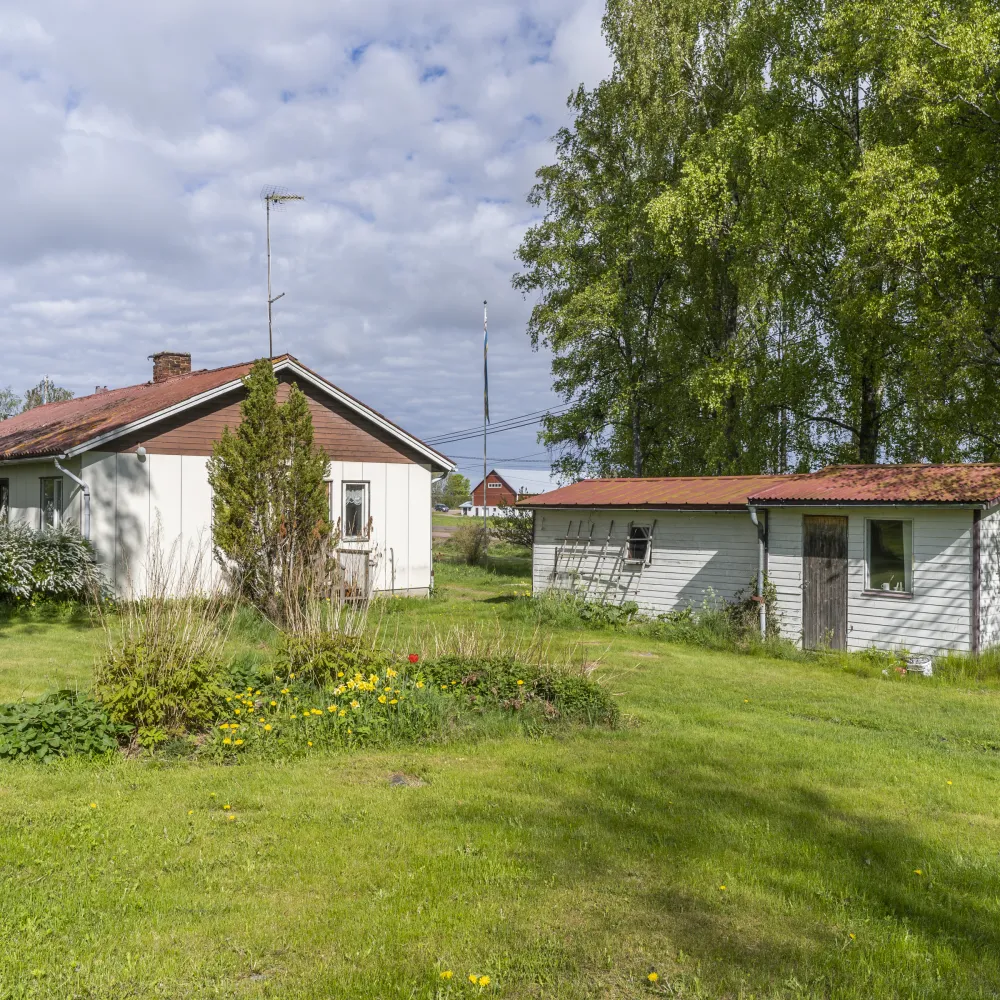 Intill bostadshuset finns et oisolerad garagage ovan gjuten platta. Taket är försett med plåt och fasaden med träpanel. Garaget har elanslutning och inrymmer en mindre bil. Garaget har i ett senare skede byggts till med ett isolerat gästrum med tapetserade väggar och plastmatta på golvet.