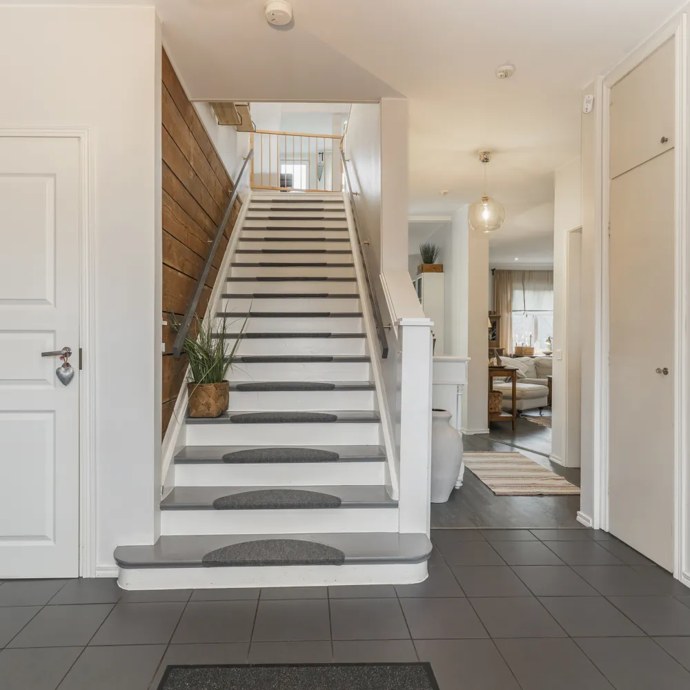 Trapphallen har klinkergolv och målade väggar. Utrymmet fungerar idag som gästrum. Utrymmet har vattenburen golvvärme.