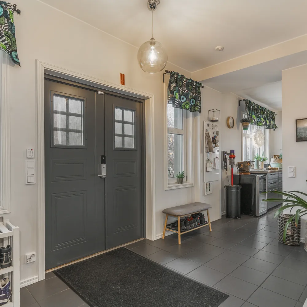 Entrén har klinkergolv, målade väggar och platsbyggda garderober med överskåp.
