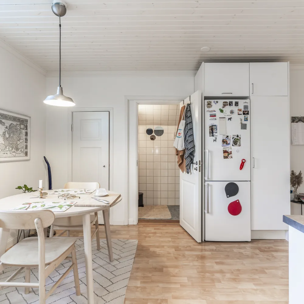Lägenheten inrymmer entréhall, kök, separata dusch- och wc-utrymmen, vardagsrum samt två sovrum. Lägenheten har ett ljust gavelläge mot norr. Bostaden renoverades ca 2012 i samband med byggnationen av bostadsbolagets nyproduktion.