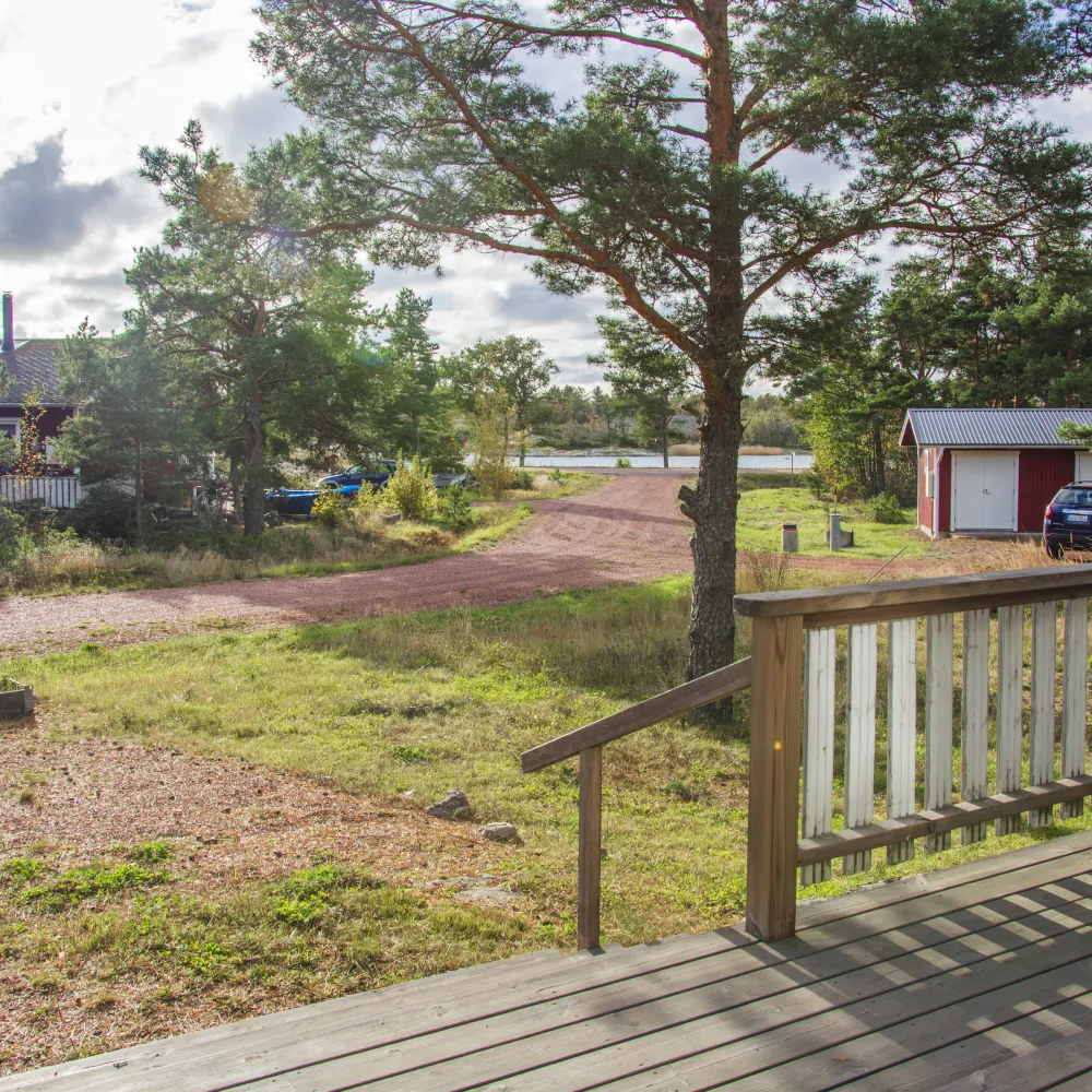 Rymlig altan finns mot husets baksida mot norr samt även längs den västra väggen av huset, till delar med viss sjöutsikt.
