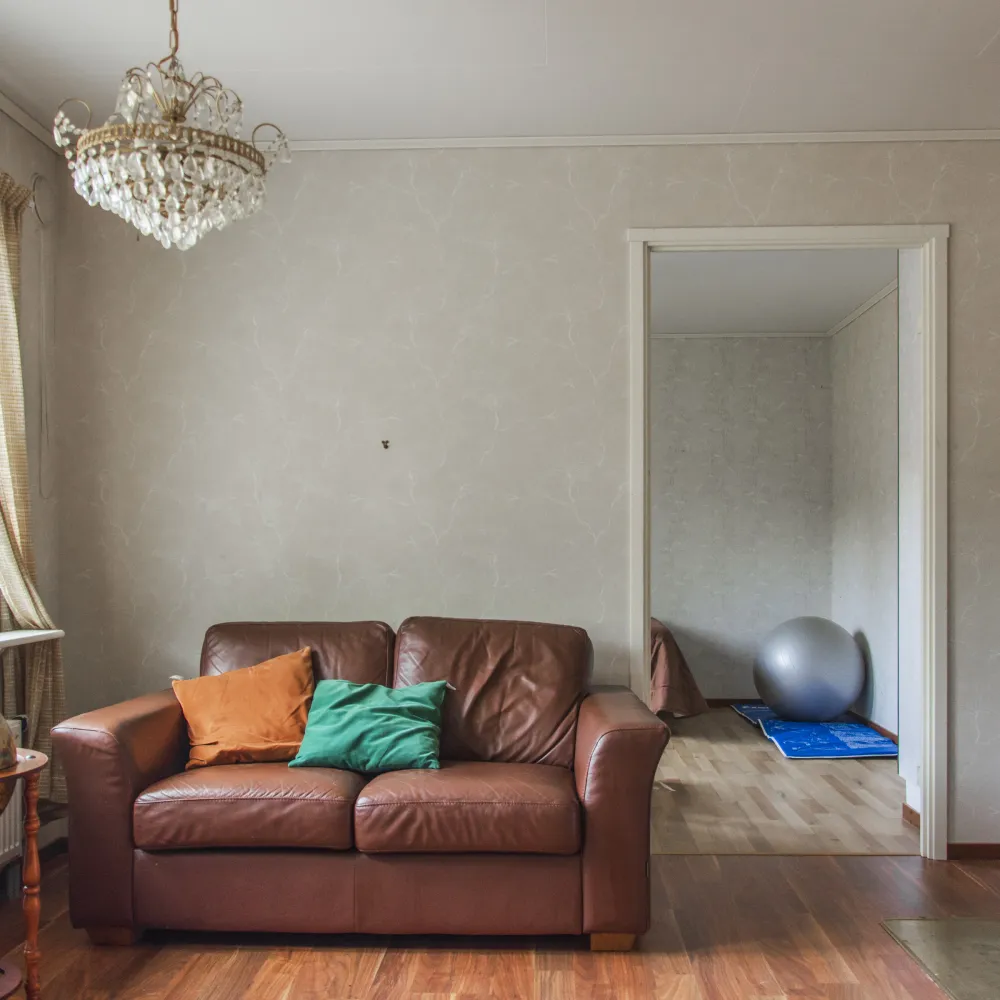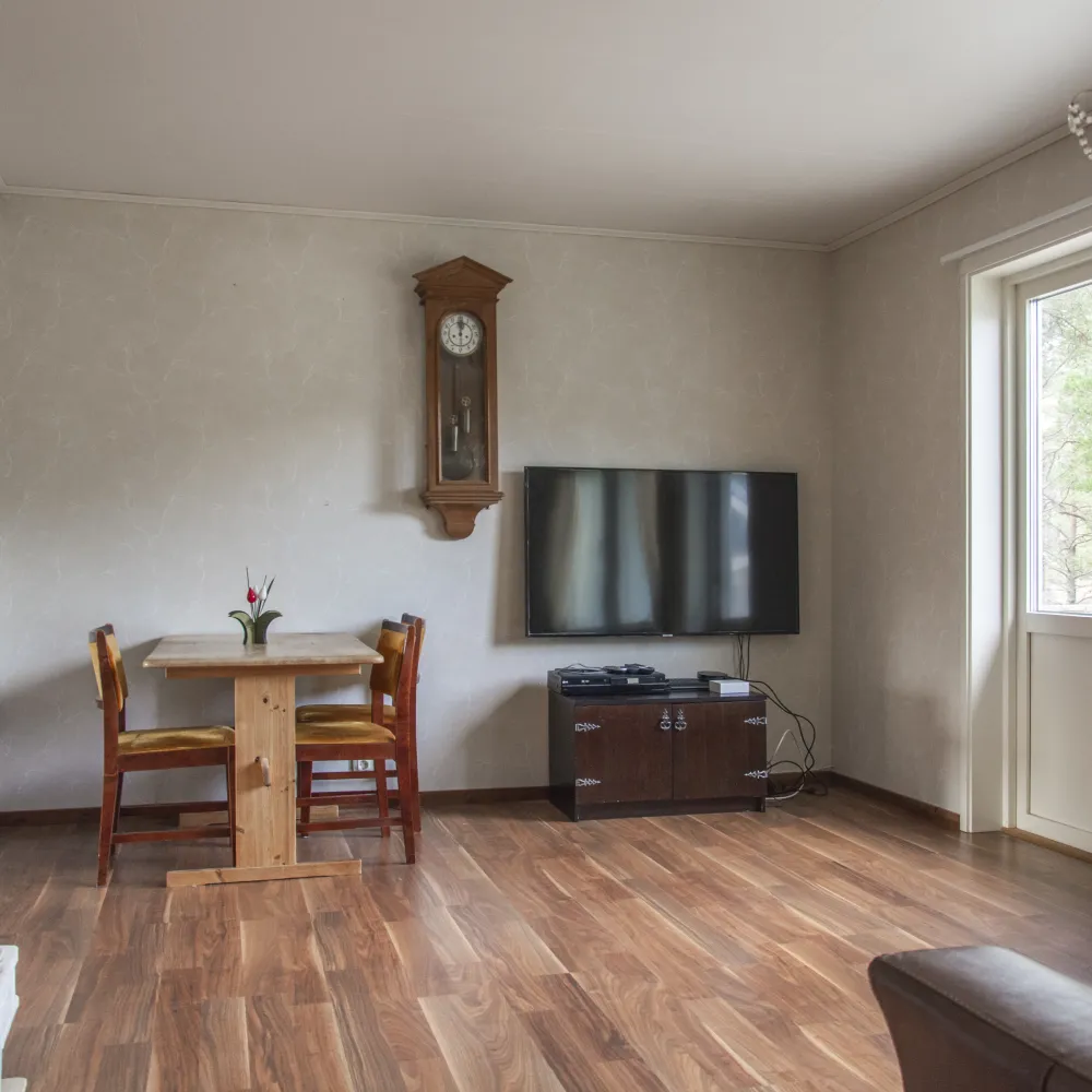 Ytskikten domineras av klickgolv och tapeter i bostadsutrymmena medan våtrummen är försedda med plastmattor.