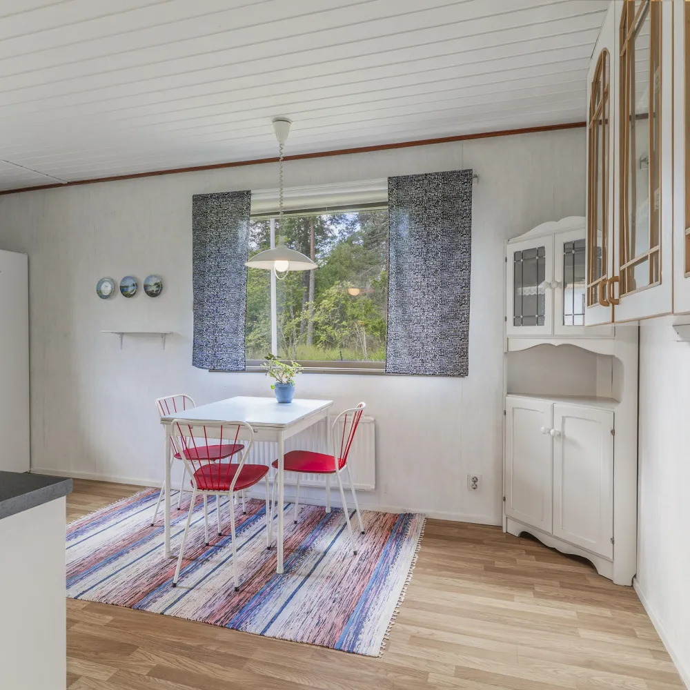 I gillestugan finns vedspis med insats samt dörr ut till altan under tak vid husets bakgård.