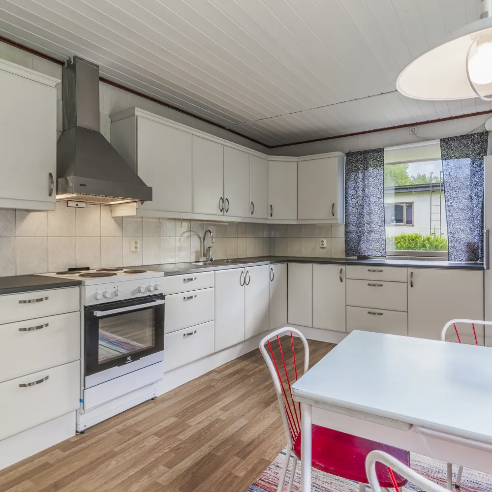 Köket är renoverat sedan byggtiden och erbjuder idag en rejäl diskbänk samt avställningsyta och skåp över två väggar.