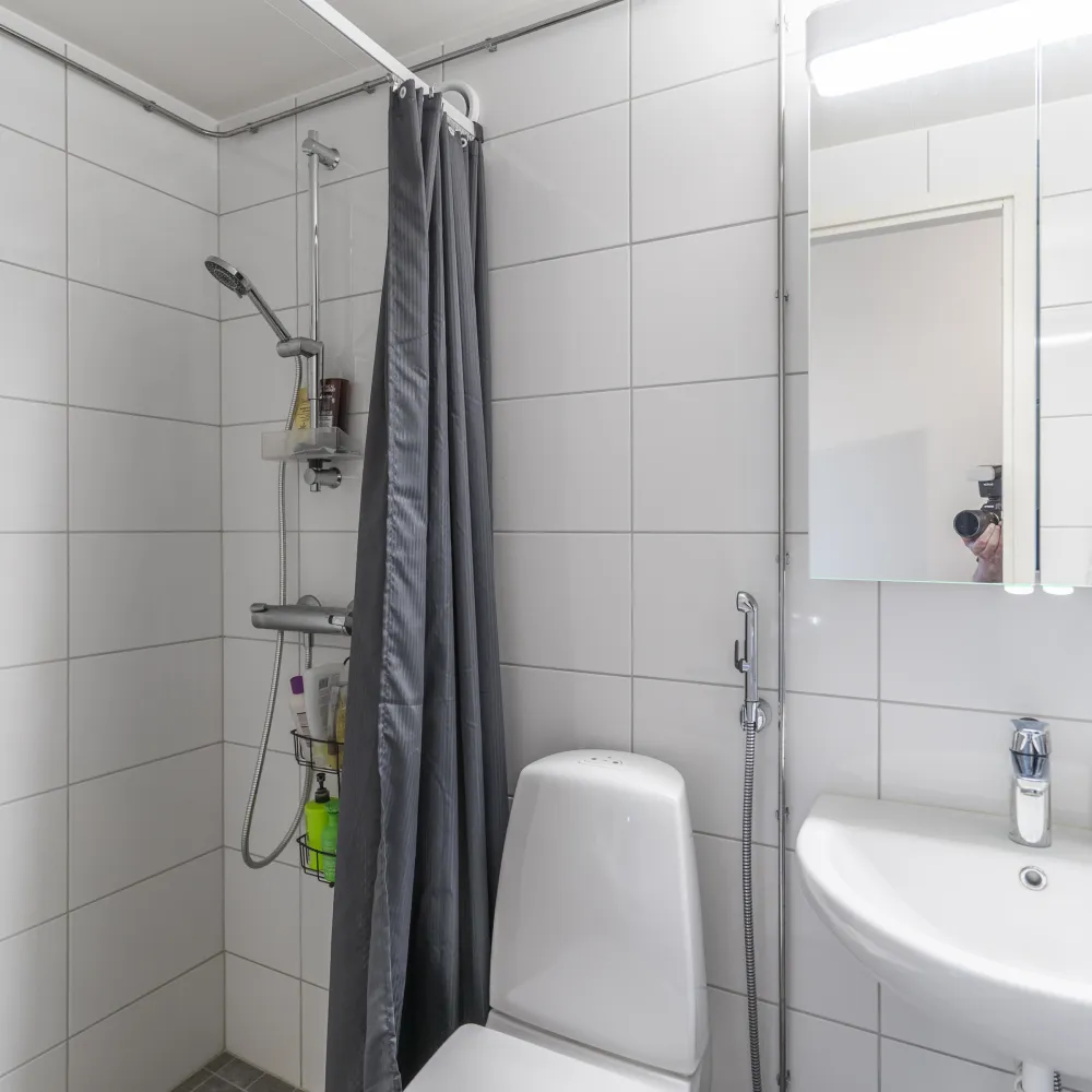 Badrummet renoverades under 2023-2024 och är i helkaklat utförande. Badrummet utgörs av duschhörna, WC, handfat och ett spegelskåp. El-golvvärme.