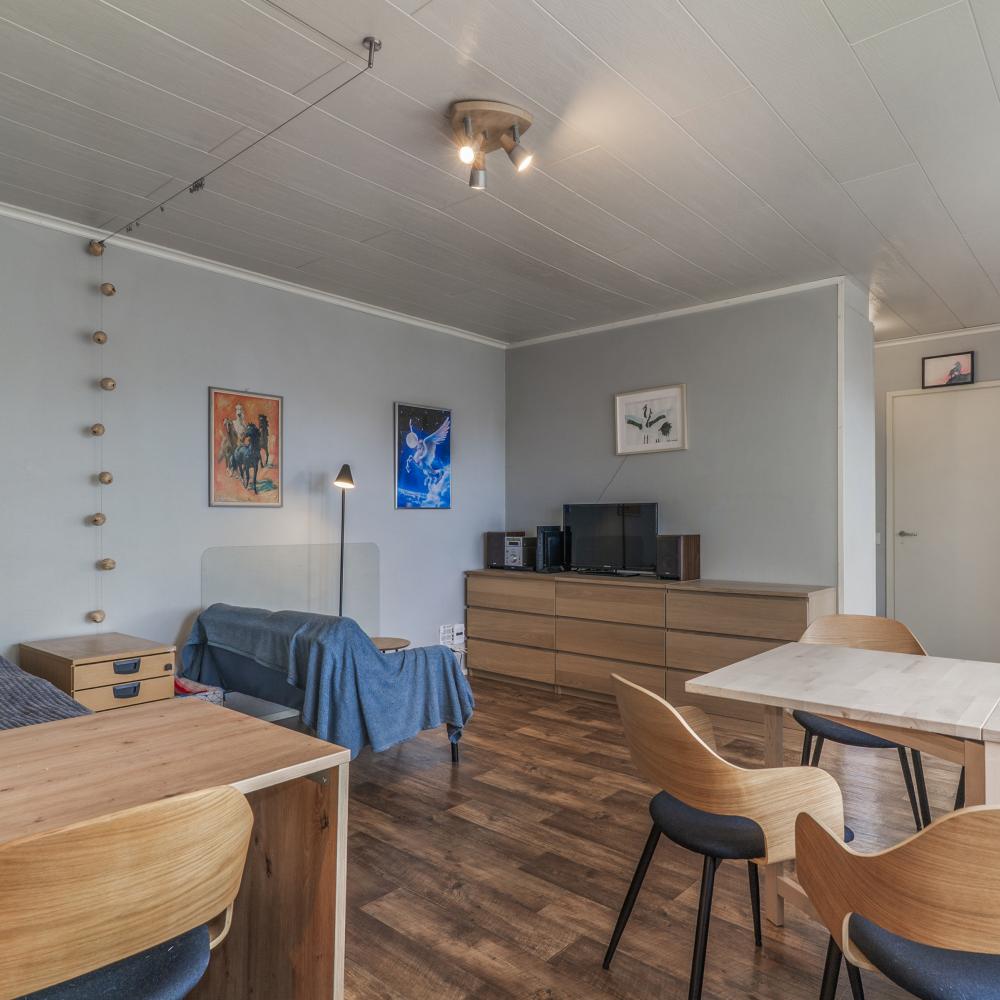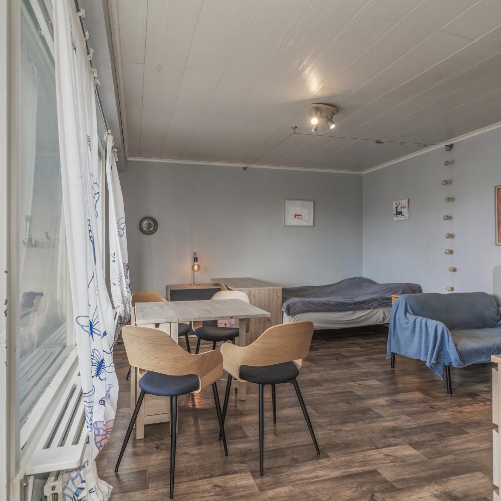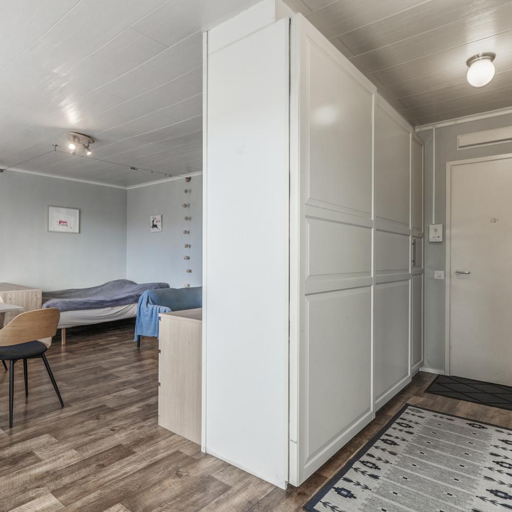 I öppen planlösning ligger ett rymligt allrum med trevligt ljusinsläpp genom stora fönster samt utgång till balkong i västerläge. Allrummet inrymmer även gott om plats för säng, soffgrupp och tv.