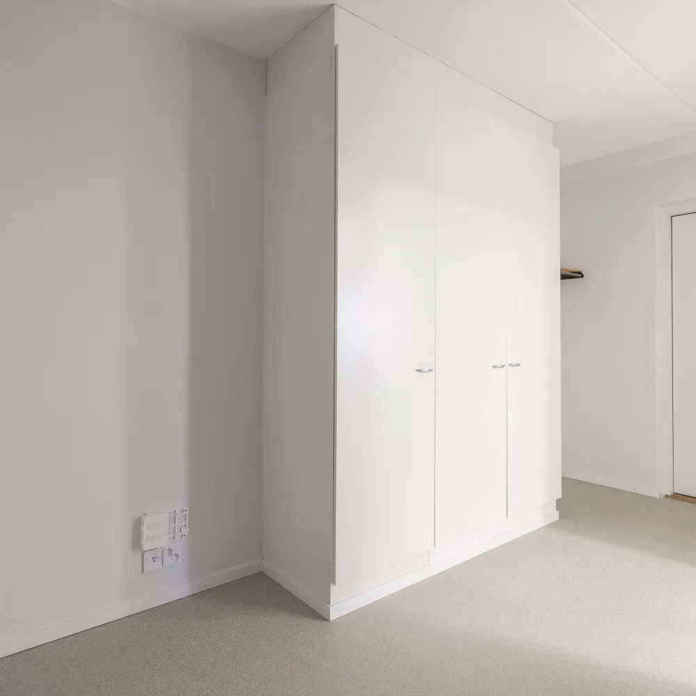 Ytskikten i lägenheten utgörs av målade väggar och plastmatta på golvet.