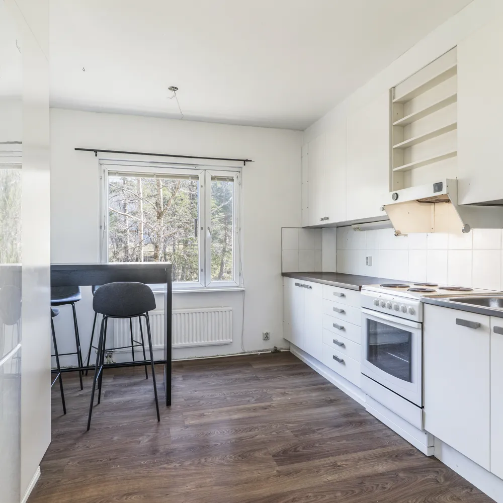 Vardagsrummet är ljust och rymligt tack vare det stora fönsterpartiet samt den ljusa färgskalan. I anslutning till vardagsrummet finns den inglasade balkongen i västerläge.
