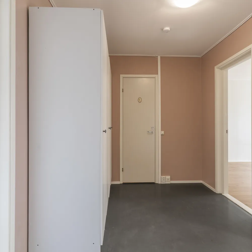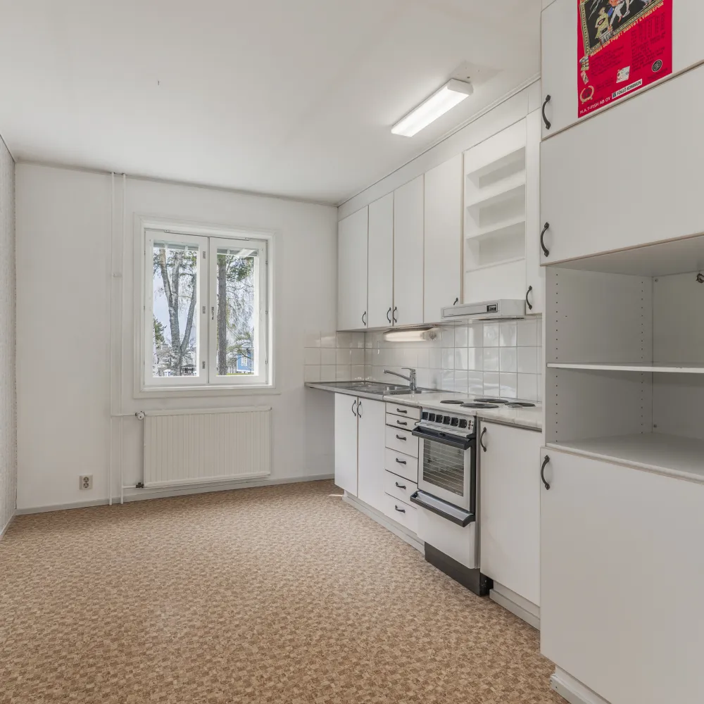 Köket är funktionellt med bland annat spis med ugn, delad kyl och frys samt ett ljust plastgolv. Från vardagsrummet når du en generös balkong som vetter mot den tysta innergården – en perfekt plats för morgonkaffe eller en stunds avkoppling. Vardagsrummet har ett fint ljusinsläpp och en öppen känsla.