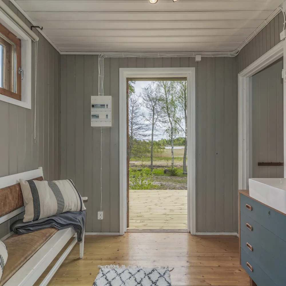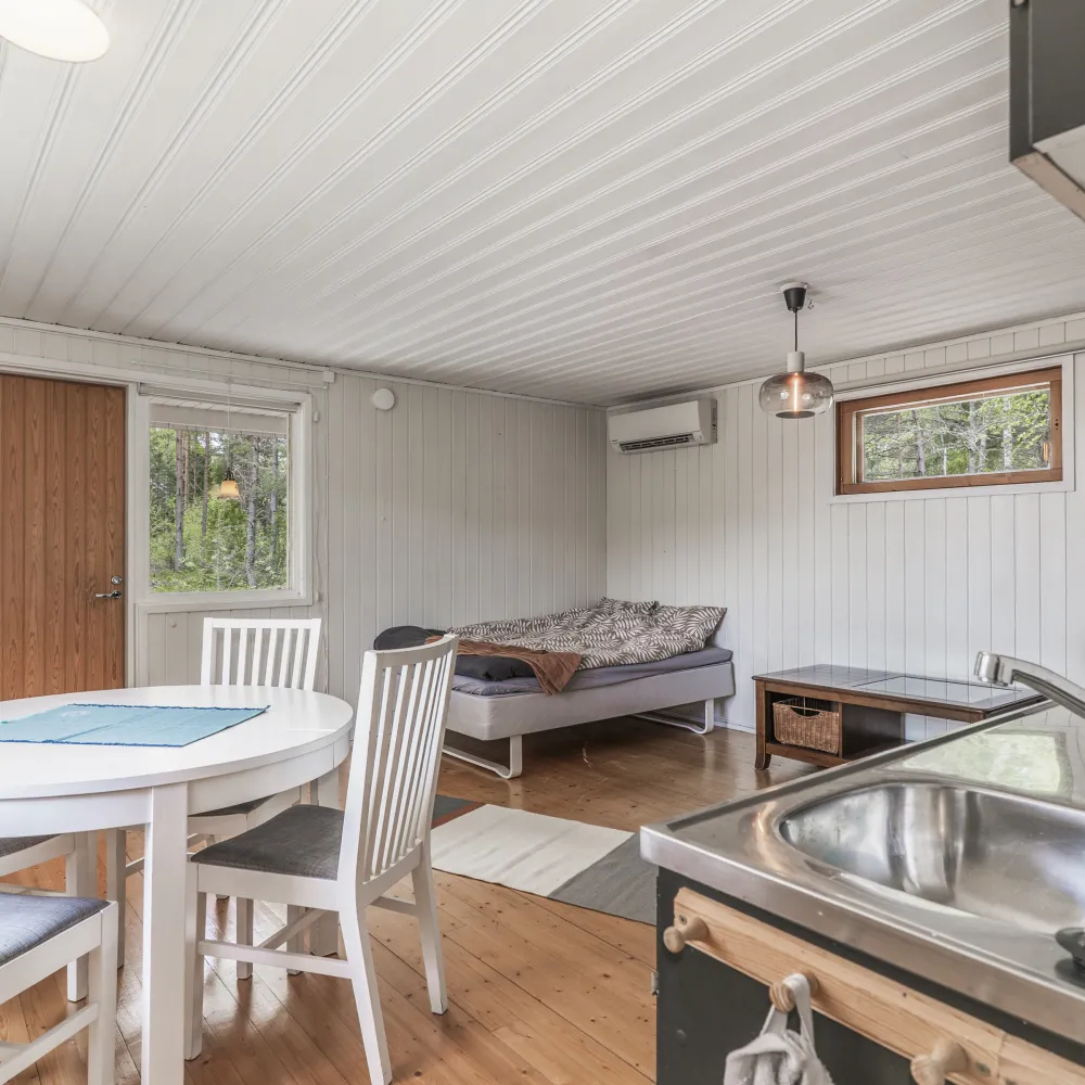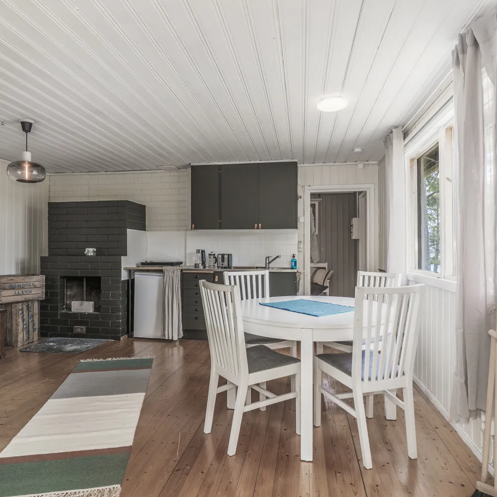 Allrummet erbjuder ett kök, matplats en eldstad och sovplats. Härifrån nås även omklädnings– och duschrummet bestående av handfat med kommod, spegel, duschhörna, bastu och därtill en egen ingång från altanen.