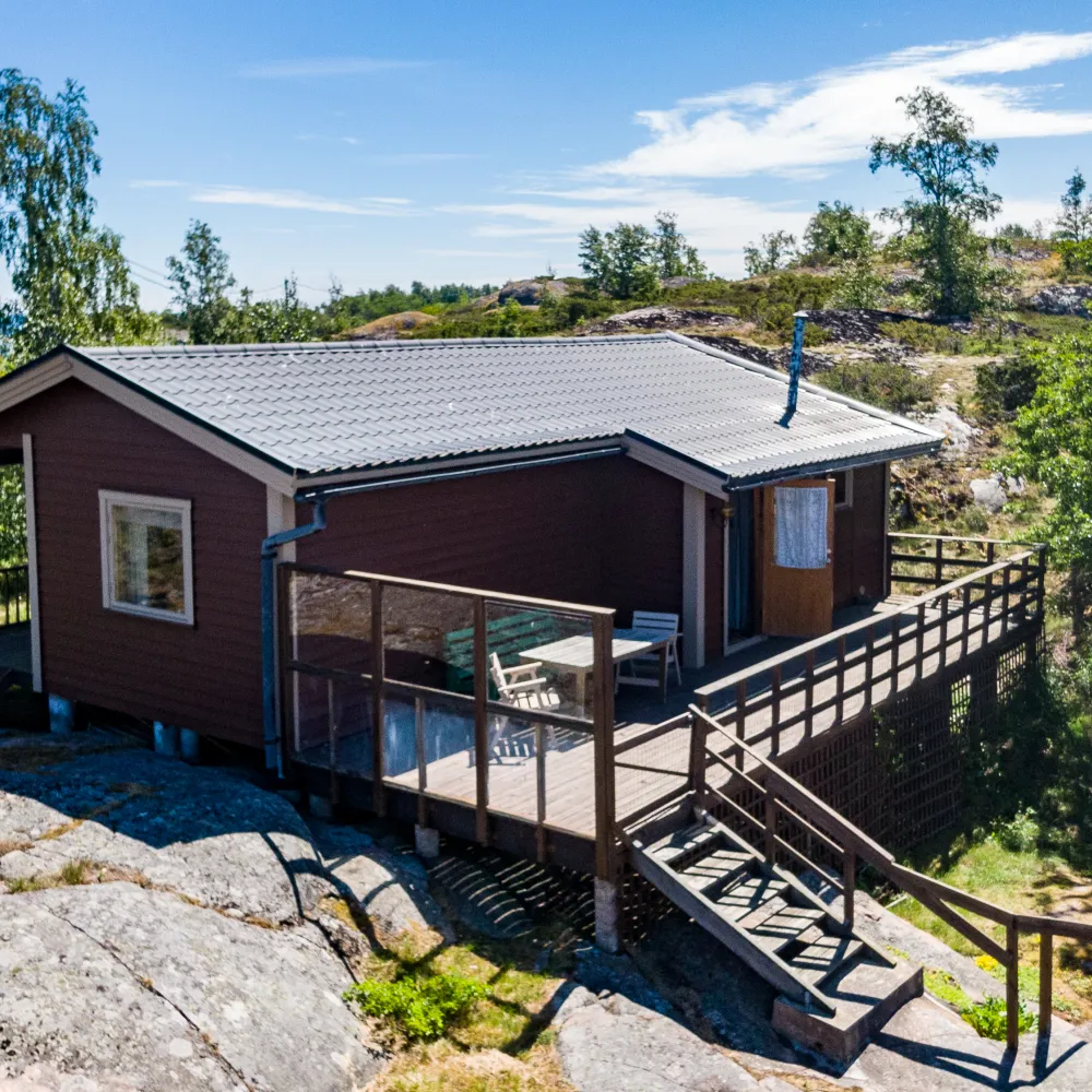 Fritidsbostaden inrymmer entré, kök med matplats, vardagsrum, två sovrum och toalett. Vid den västra sidan ansluter rymlig altan med kvällssol.