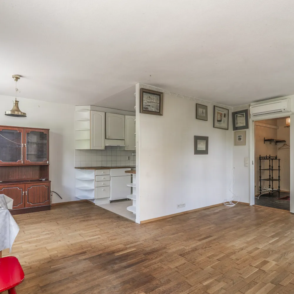 Vardagsrummet är rymligt och har trivsamt ljusinsläpp genom flera stora fönster. Här finns gott om utrymme för matbord, soffa och tv-möblemang. Golvet är försett med original parkett och väggarna är tapetserade. Här finns även en luft-luftvärmepump vilken installerades för ca. 10 år sedan.