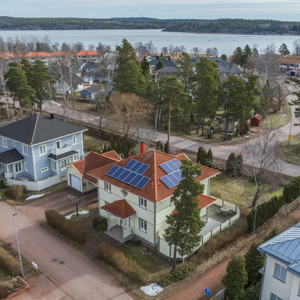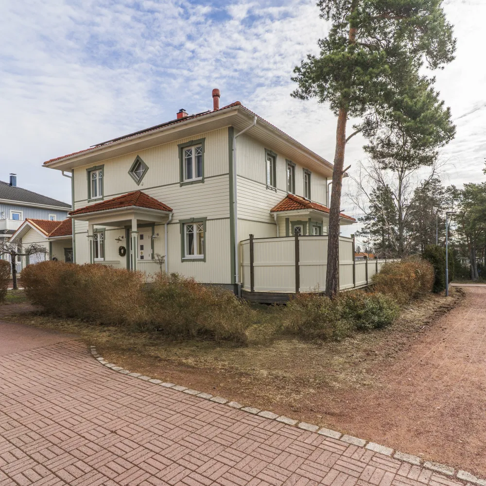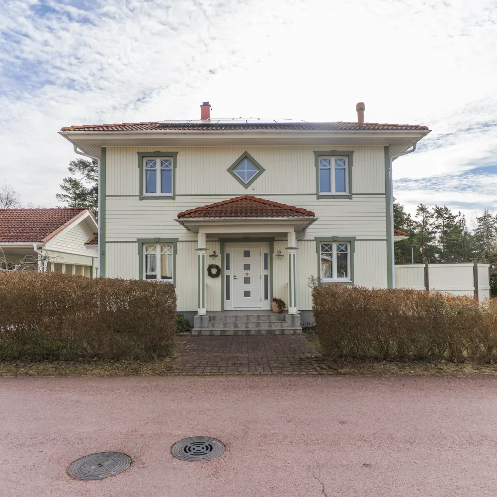 Välhållen egnahemsvilla uppförd 2003 i träelement i två fulla våningsplan på isolerad betongplatta. Fasaderna är klädda med träpanel, senast målade 2024 och yttertaket är lagt med tegelpannor.