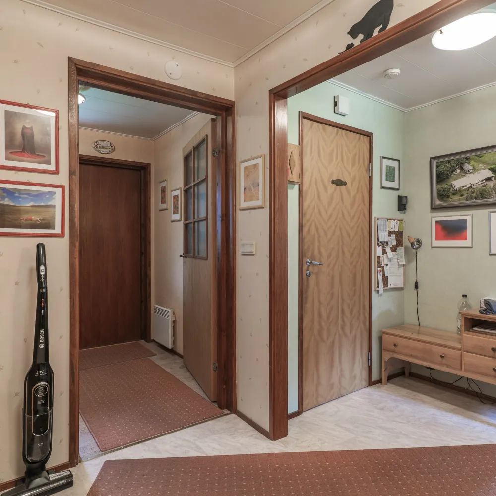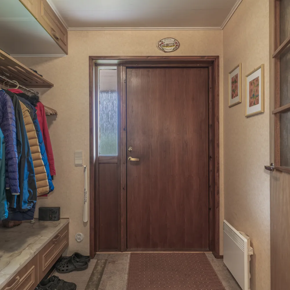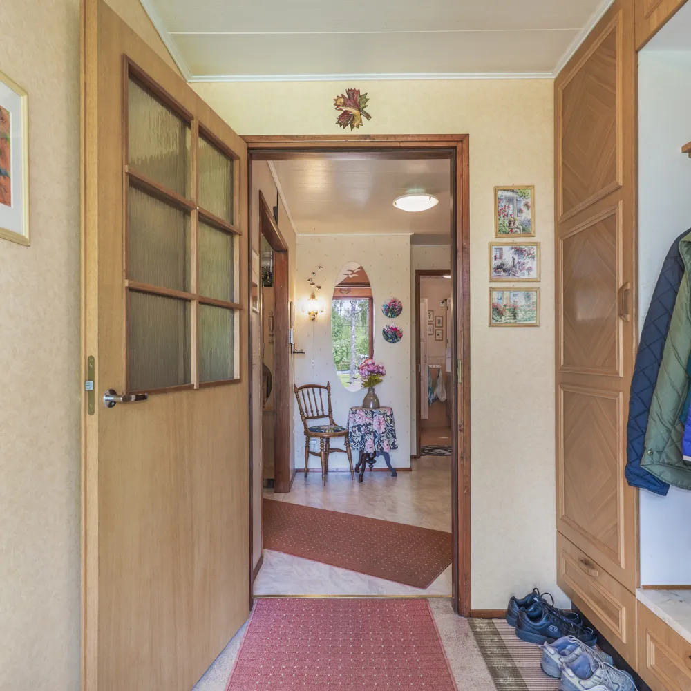 Entrén är försedd med goda avhängningsmöjligheter. Härifrån nås hallen, där det även finns ett förråd.