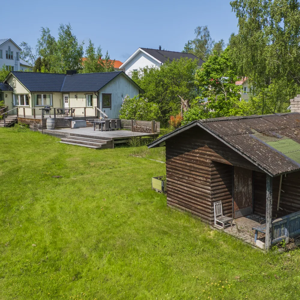 Tomten är lättskött med gräsmattor, några planteringar och gott om plats för lek, odling eller framtida projekt. Uteplatsen är anlagd i etage och bjuder på både funktion och karaktär. Här kan du njuta av solens strålar från morgon till sen eftermiddag.