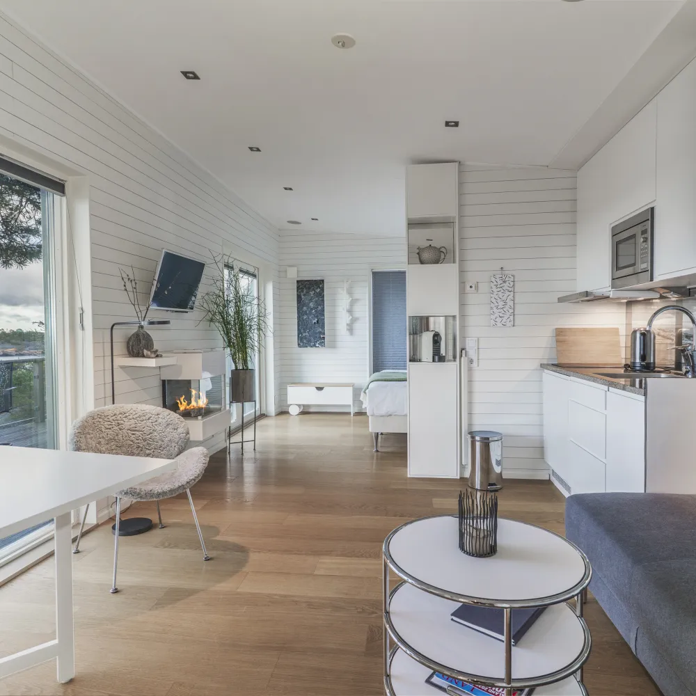 I mitten av rummet finns även en gasspis som tillför en härlig stämning till svithuset.