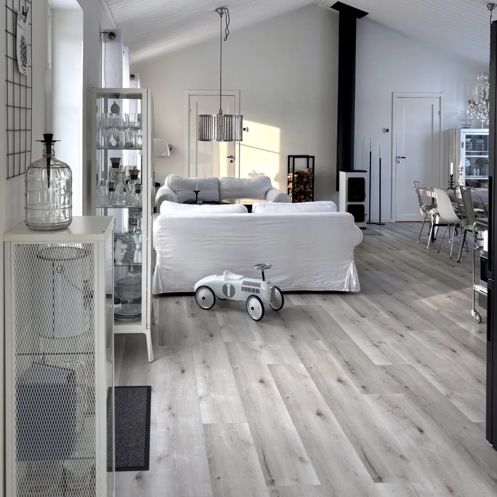 De invändiga ytskikten domineras av målade väggar, vinylgolv och vita, panelklädda innertak. Badrummet har våtrumsmatta och delvis kaklade, delvis målade väggar.