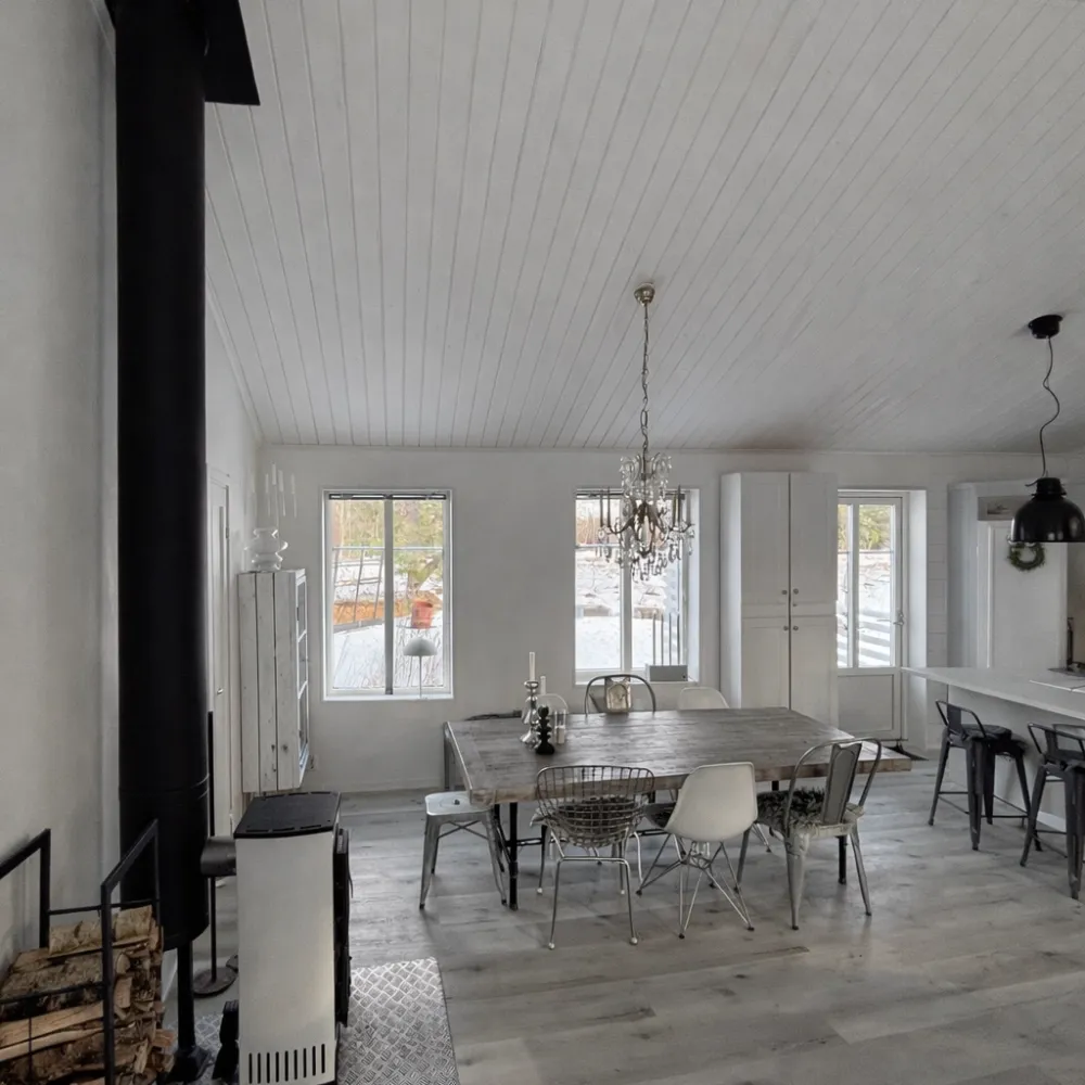 Den öppna planlösningen erbjuder genom sina brutna tak en mycket god volym och generöst med ljusinsläpp från både väster och öster. Här finns också trivsam vedkamin och luft-luftvärmepump erbjudande såväl komplementsvärme som kyla under sommarens varma period. Från den öppna planlösningen finns altan- och/eller trädgårdsaccess mot både väster och öster.
