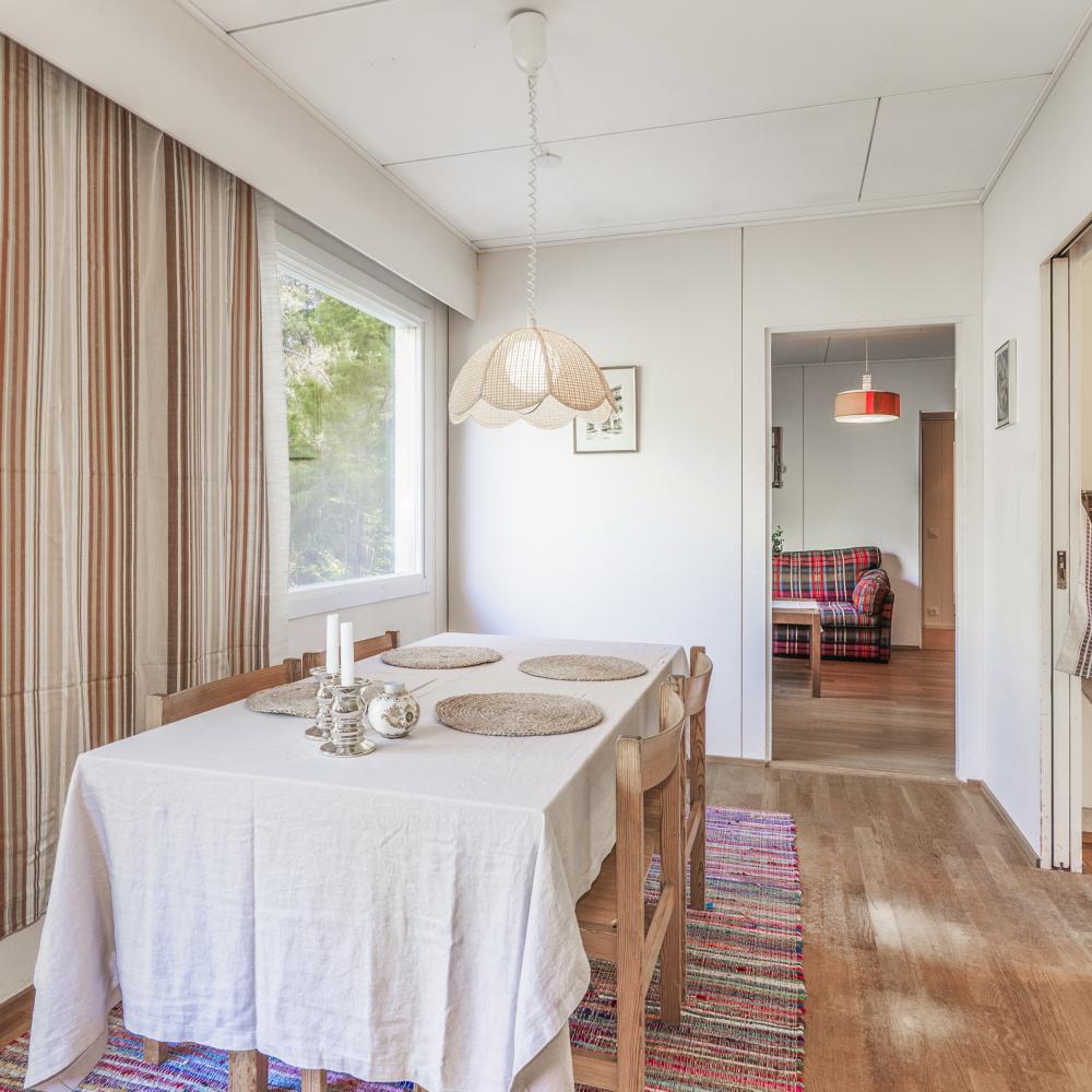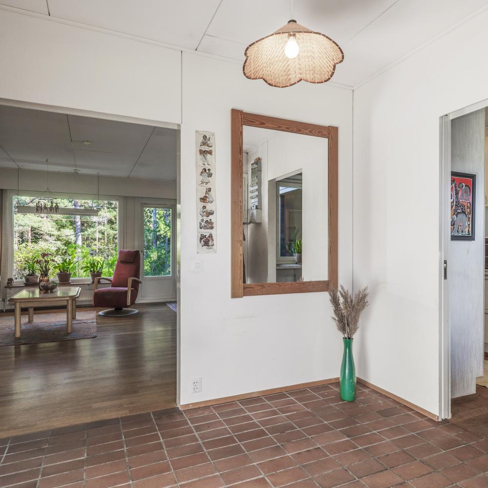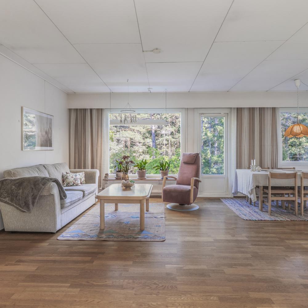 Lägenheten har det södra gavelläget i radhuset som mo såväl öster som mot söder angränsar till skogsområden.