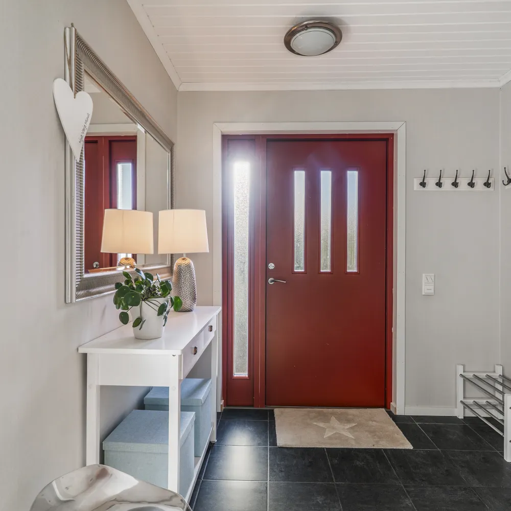 Golvytorna i bostadsdelen varierar mellan klinker, klickgolv och modern 14 mm ekparkett.
