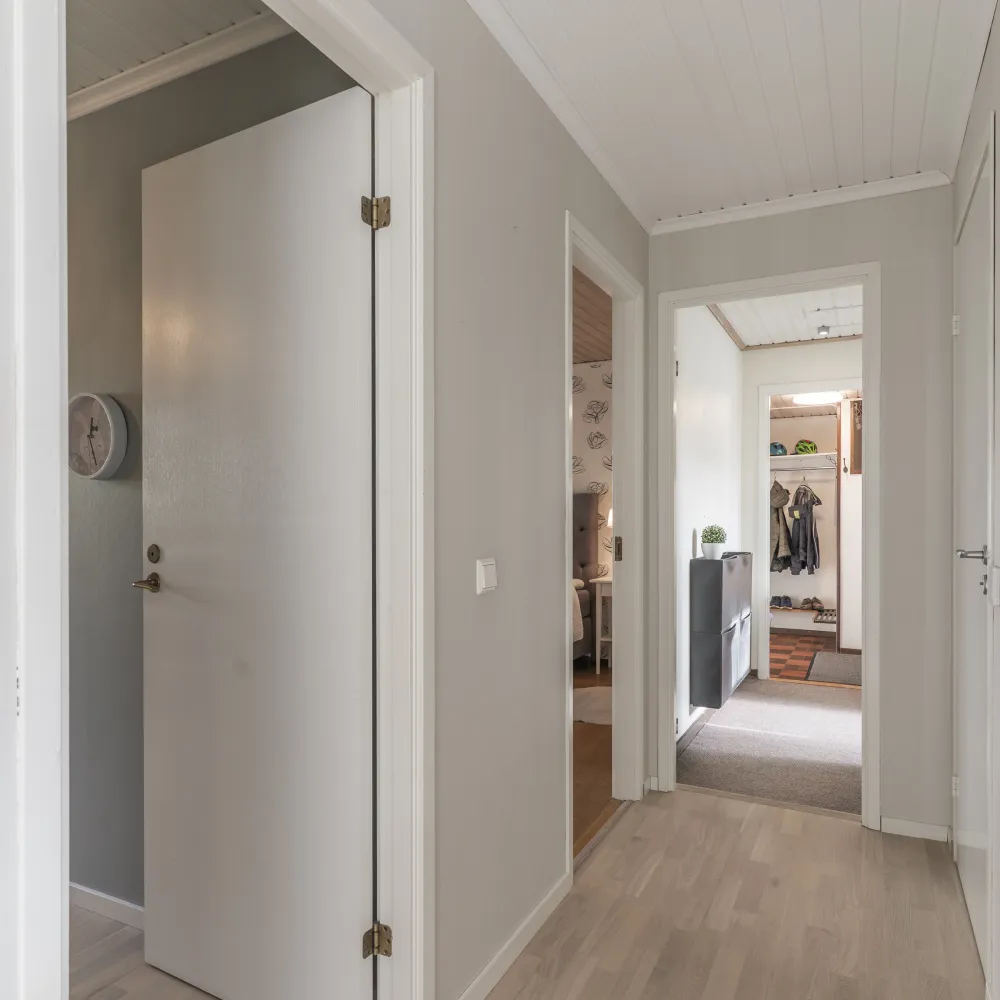 Två av sovrummen har förvaring i klädkammare och i mastersovrummet finns hel garderobsvägg samt dörr ut till trädgården.