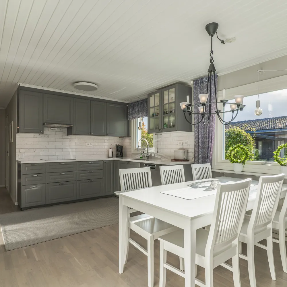Köket är helrenoverat under 2018 och erbjuder idag rejält med skåpförvaring på tre väggar samt en öppen planlösning gentemot matplatsen. Vitvarorna utgörs av hel kyl och frys, varmluftsugn och kombiugn/mikrovågsugn i ergonomisk höjd, elspis med induktionshäll samt diskmaskin. Inredningen har en modern tappning i form av mörkgråa skåpluckor, bänkskiva i stenkomposit och modernt kaklade stänkskydd mellan över– och underskåp.