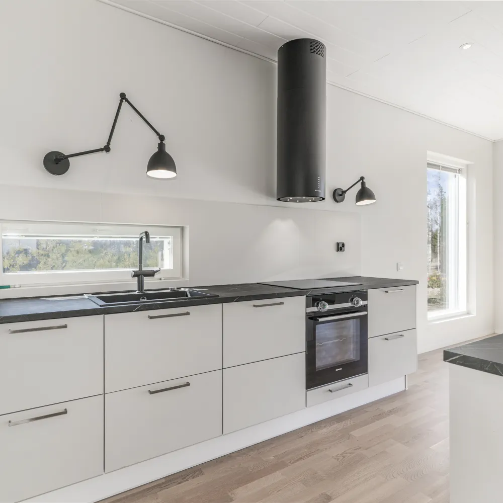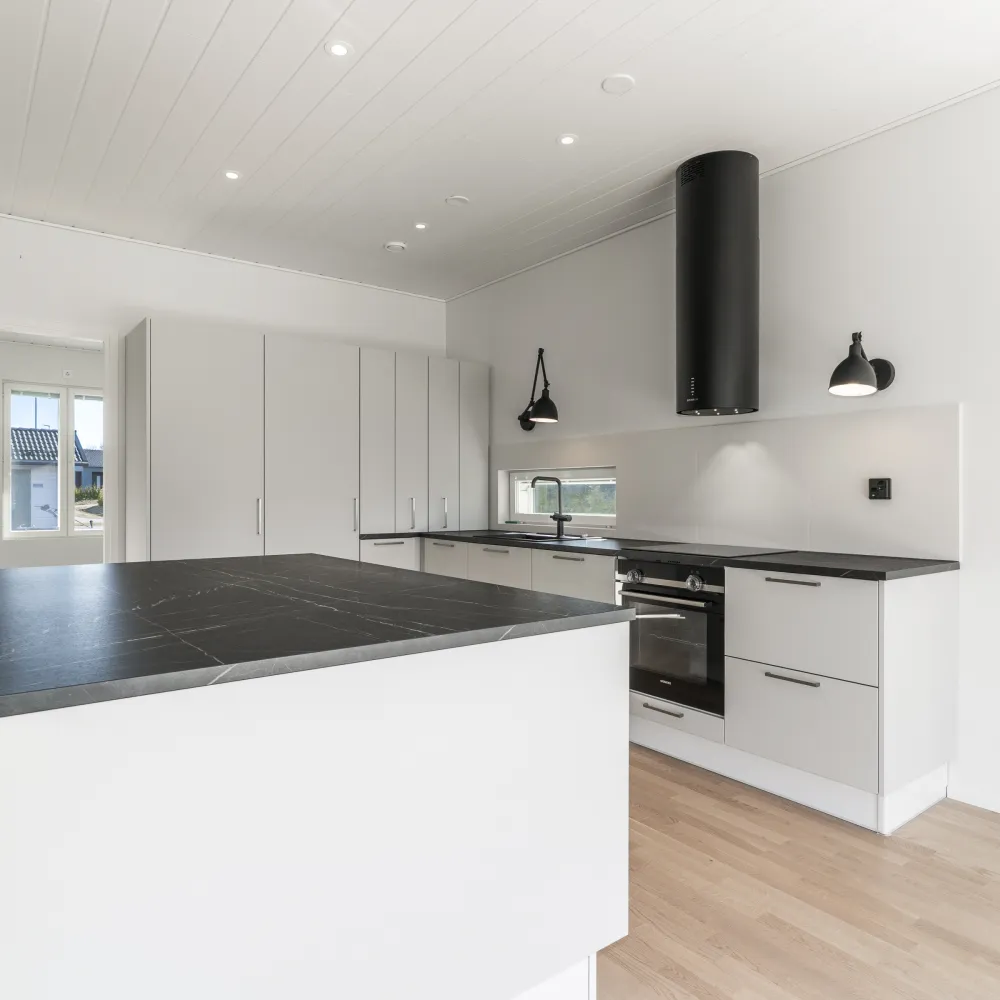 Köket är givetvis modernt utrustat med fullstor diskmaskin integrerad med skåpinredningen, spis med induktionshäll, ugn samt kyl/frys, även de sistnämnda integrerade med inredningen. Rymlig köksö med gott om skåpförvaring och avställningsyta avgränsar köket och det stora vardagsrummet med generösa fönsterpartier och dörr till uteplatsen och gården mot väster.