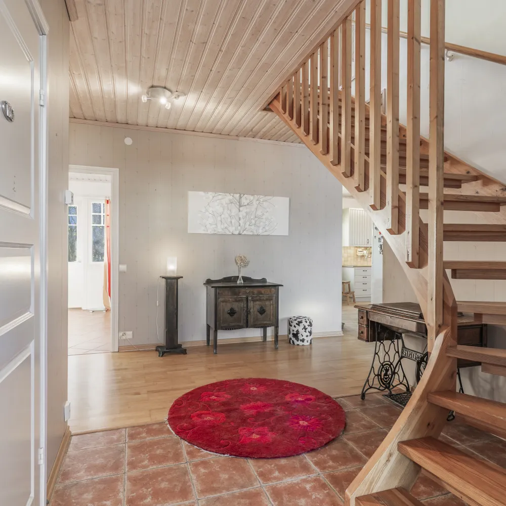 I den första bostadsvåningen finns en rymlig farstu och entréhall, två sovrum, förråd, grovkök, wc, badrum med bastu, kök, vardagsrum samt matsal i burspråk. Accesspunkter utifrån ges bekvämt från huvudentré, grovkök och burspråk.