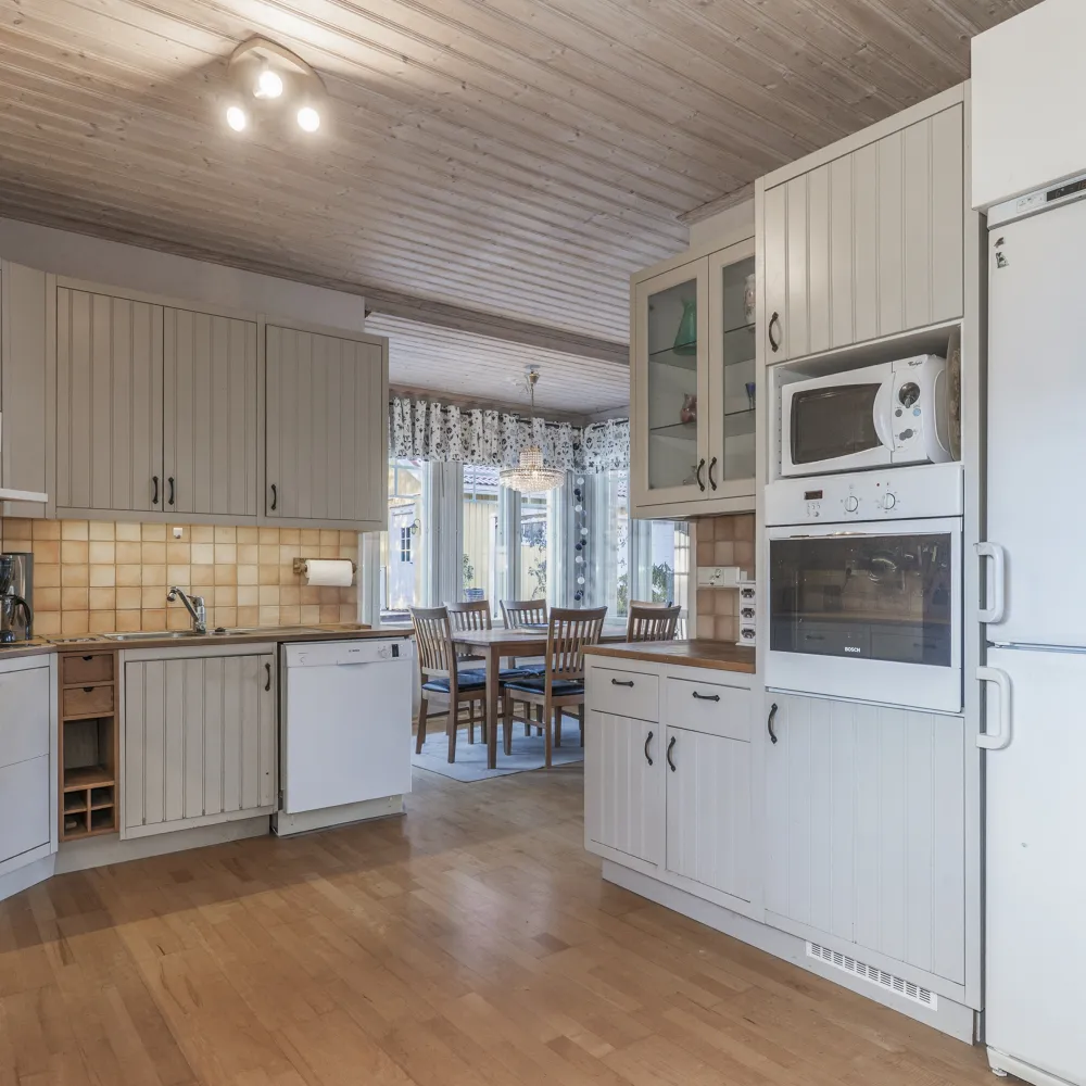 Köket är rymligt och försett med vitvaror i form av diskmaskin och spis (förnyade sedan byggtiden) samt kyl/frys och ugn i ergonomisk arbetshöjd. Från köket ansluter matplats i trivsamt burspråk och vardagsrum som endast avdelas med vägg bestående av värmebevarande kakelugn.