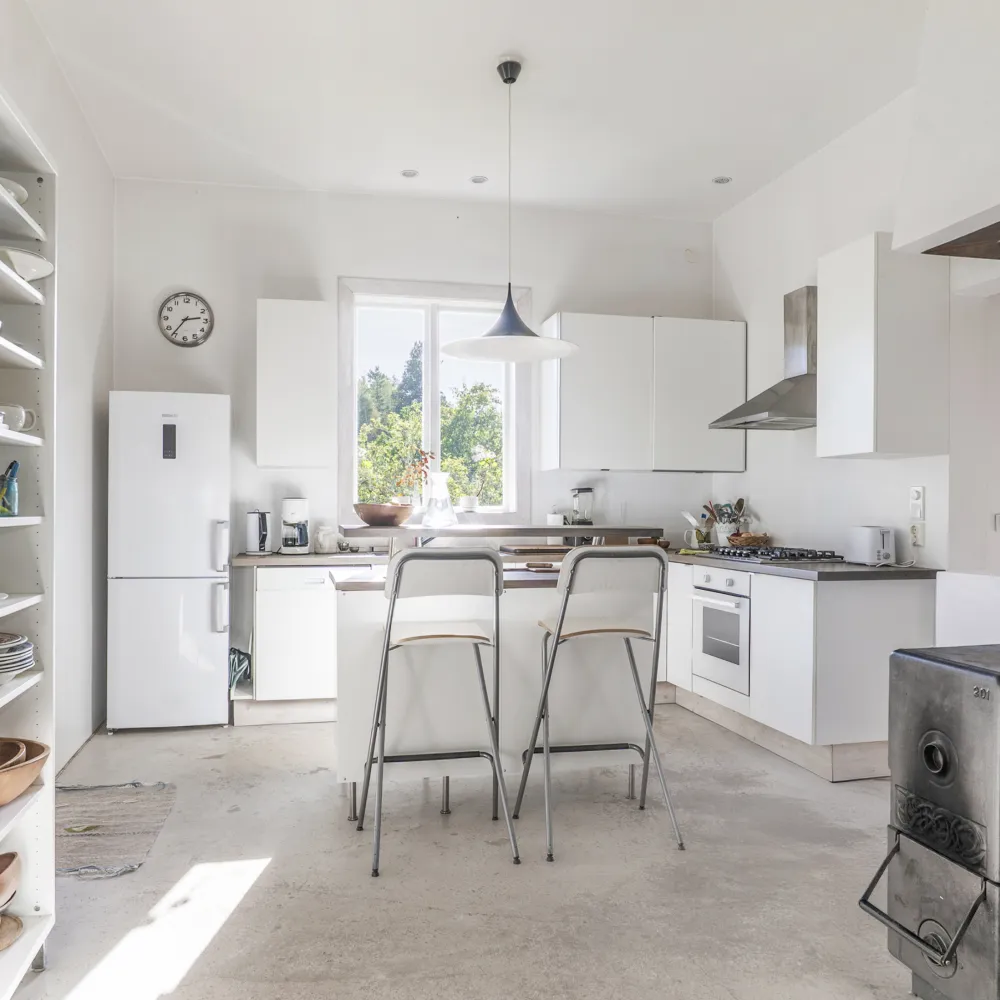 Interiört domineras bostaden av restaurerade originalträgolv, träpanelade innertak och målade väggar. Klassiska glasade dubbeldörrar förbinder flera av rummen, och takhöjden på entréplanet är genomgående generös. I vardagsrummet finns en fungerande kakelugn.