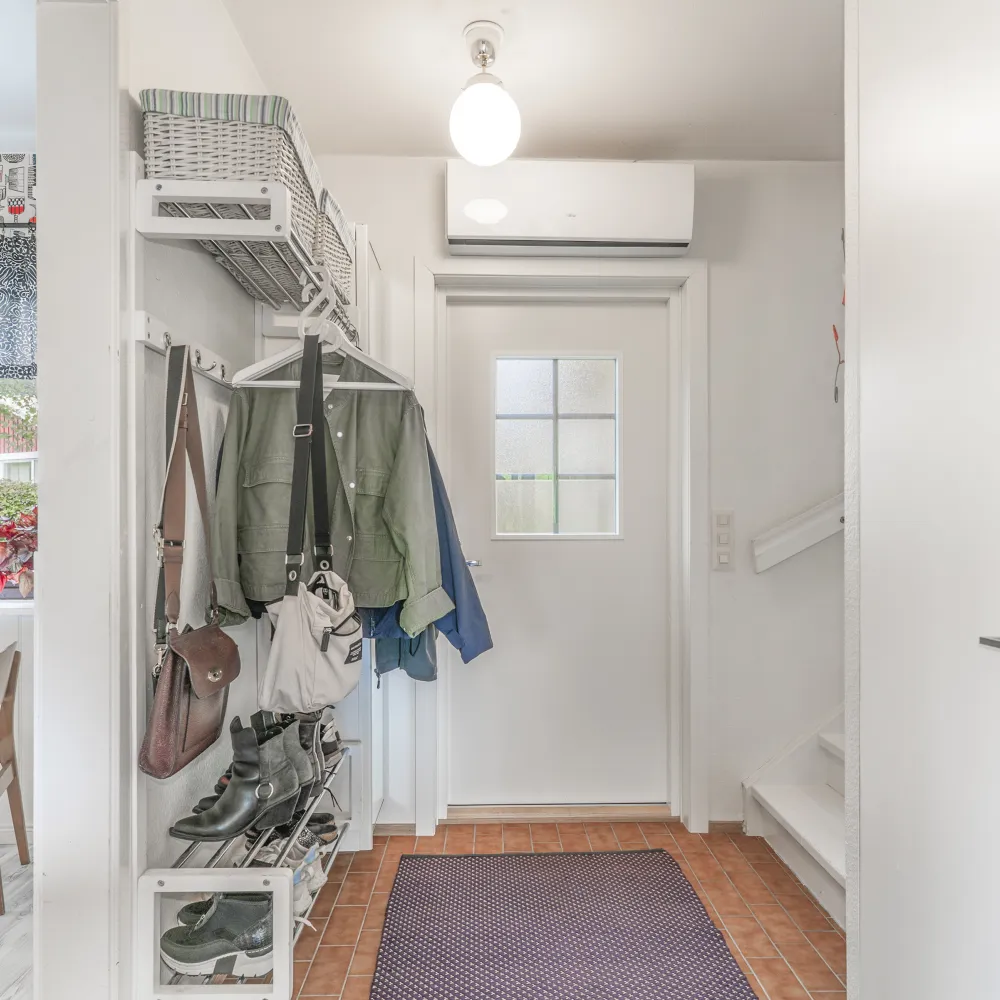 Det större av sovrummen ansluter till klädkammare och i det mindre sovrummet finns garderobsförvaring.