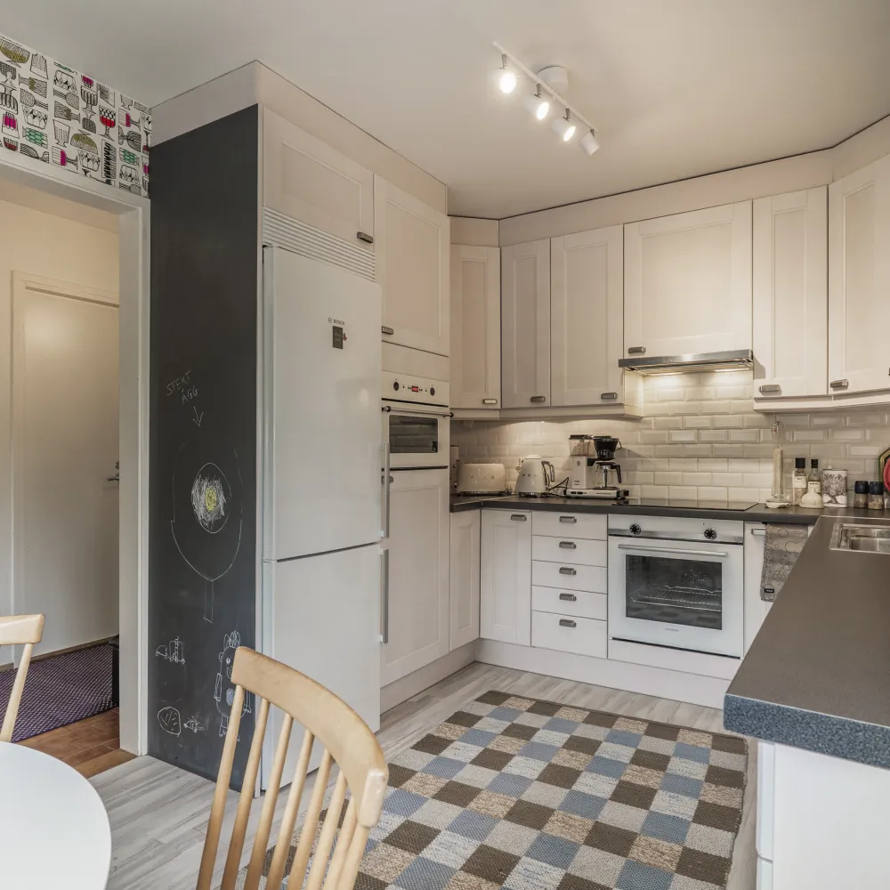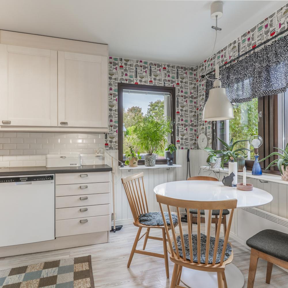 Köket är u-format med gott om förvaring och är renoverat under 2011, idag fullt utrustat med kyl/frys (2017), ugn och spis med induktionshäll (2023) samt diskmaskin (2019). Köket har plats för matbord invid fönster.