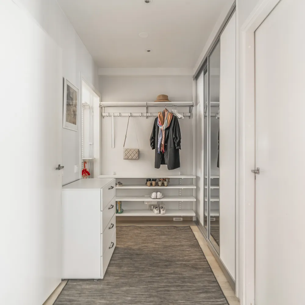 Hallen inrymmer gott om avhängningsmöjligheter samt bra förvaring i form av skjutdörrsgarderober.
