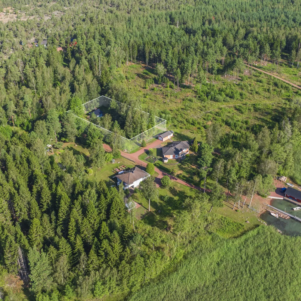 Tomten är belägen i en östersluttande backe med viss sjöutsikt från stugan och tomten. Fristående altan och växthus finns uppfört.