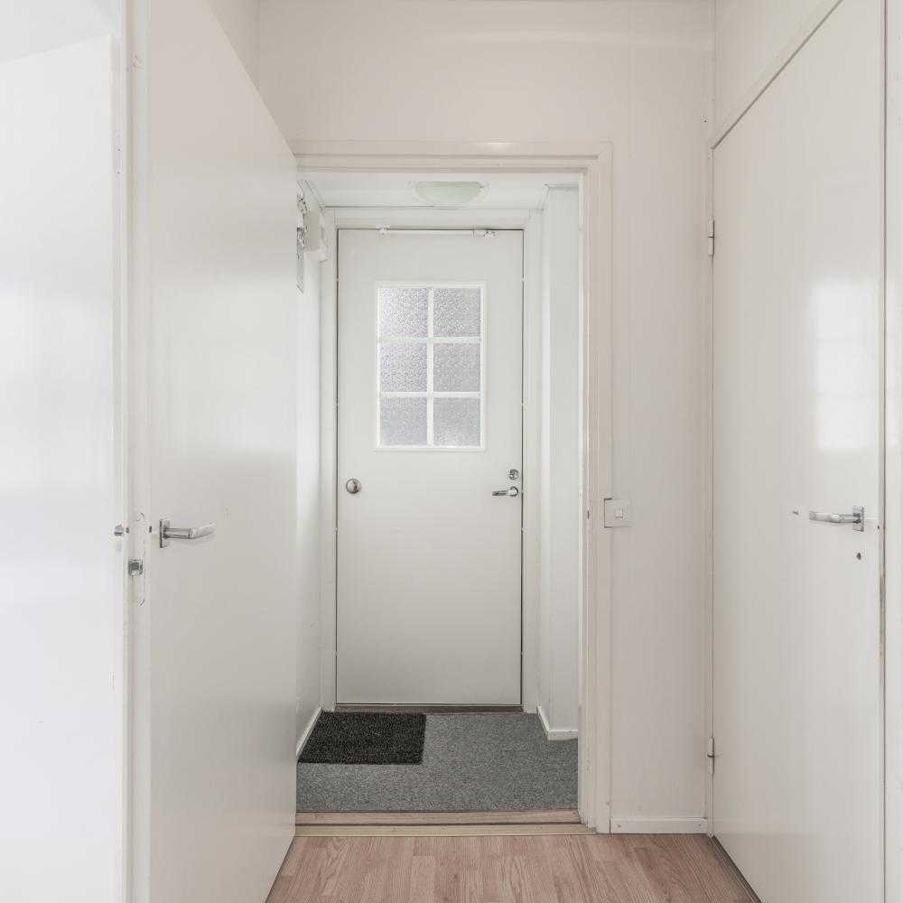 Lägenheten är belägen i den andra bostadsvåningen och disponeras av entré, vindfång, hall, två sovrum, vardagsrum, kök och badrum.