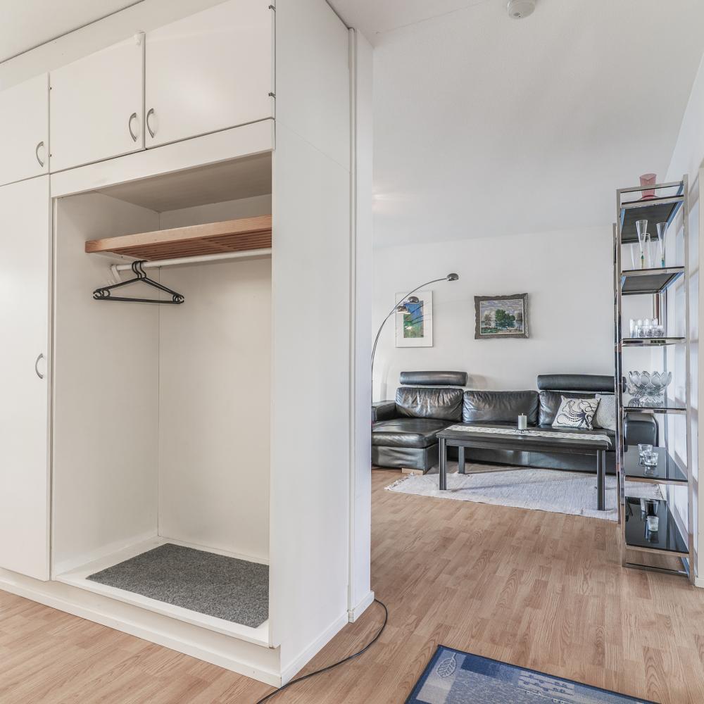 I hallen finns garderober och avhängningsmöjligheter som avskärmar till vardagsrummet.