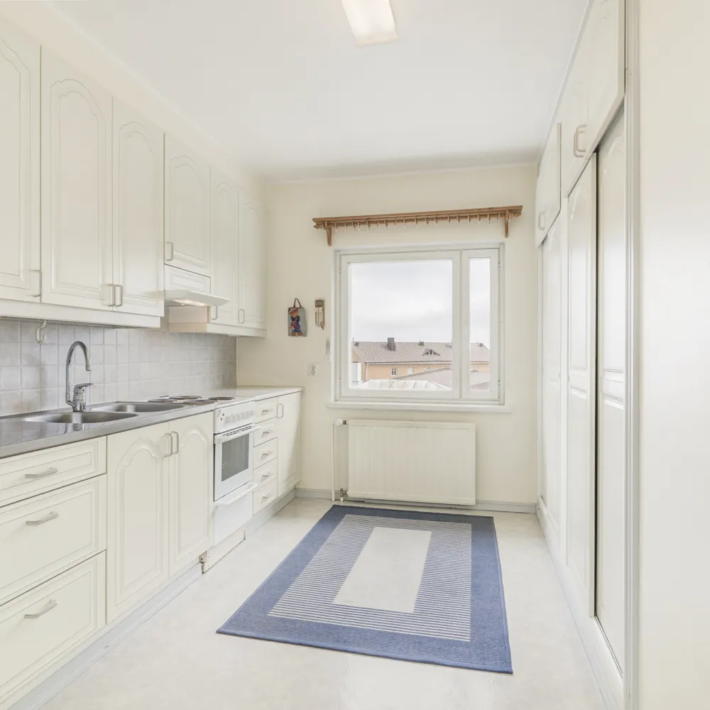 Köket är utrustat med skåpinredning vilken förnyades i början av 90-talet. Vitvarorna utgörs av köksspis, ugn, fläkt och kyl/frys. Köket inrymmer gott om förvaring.