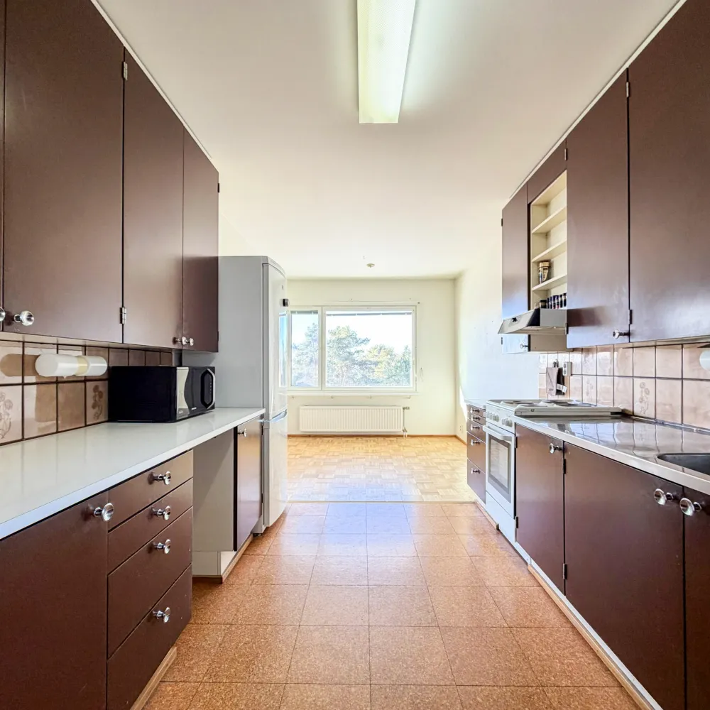 Köket har kvar sin ursprungliga karaktär och är välplanerat med gott om arbetsytor och många genomtänkta förvaringsmöjligheter. Här finns kyl/frys, elspis samt uttag för diskmaskin som tillsammans skapar ett praktiskt och funktionellt kök för både vardag och gäster