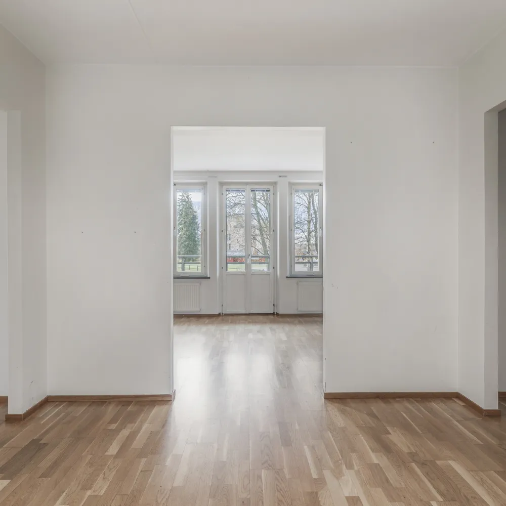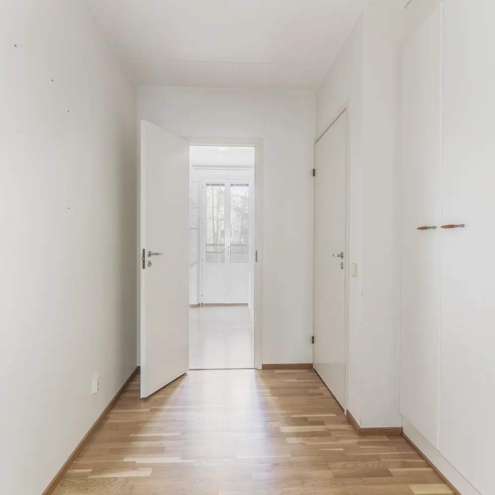 Utöver våtrummen som har klinkergolv är övriga delar av lägenhetsytorna försedda med parkett och väggarna är tapetserade/målade.