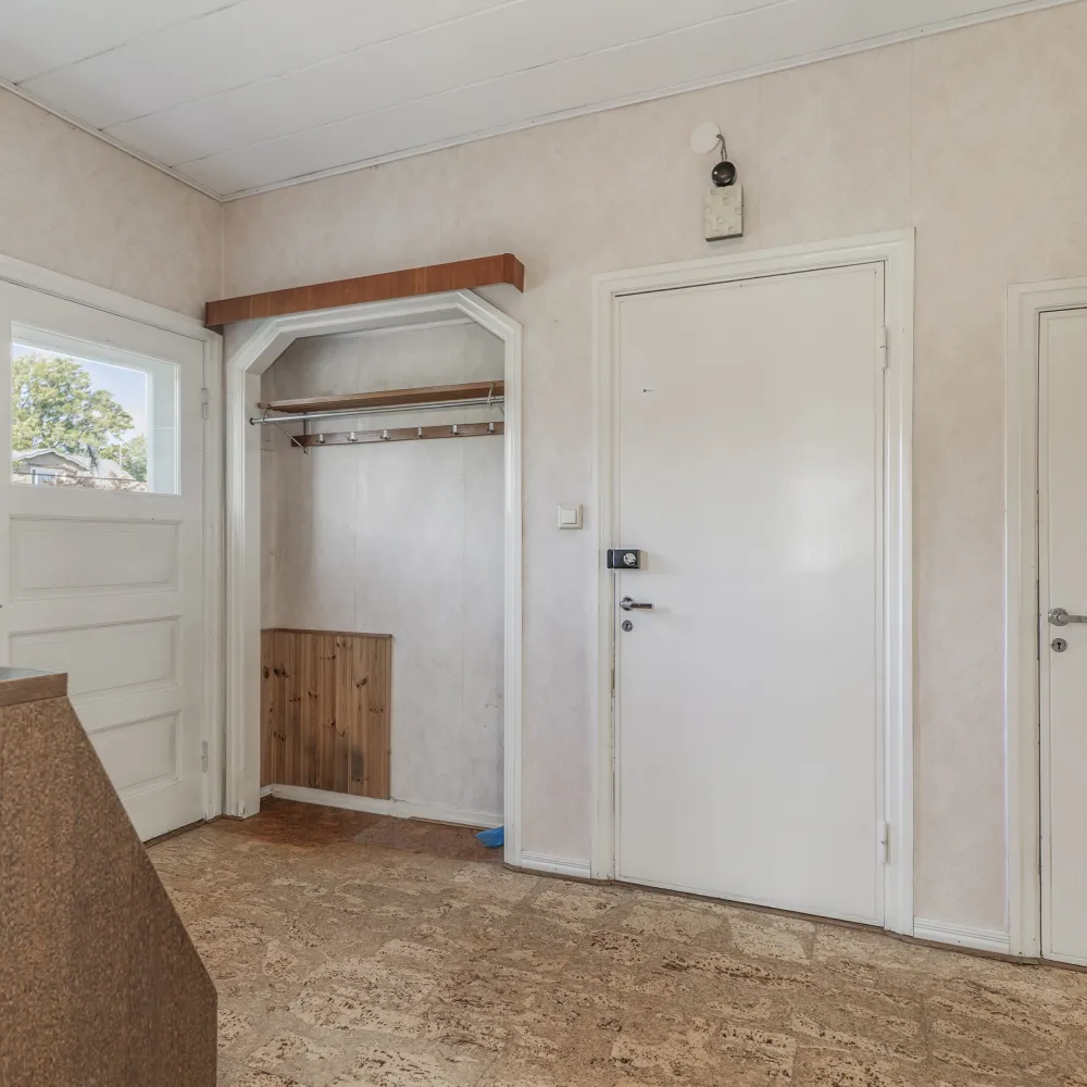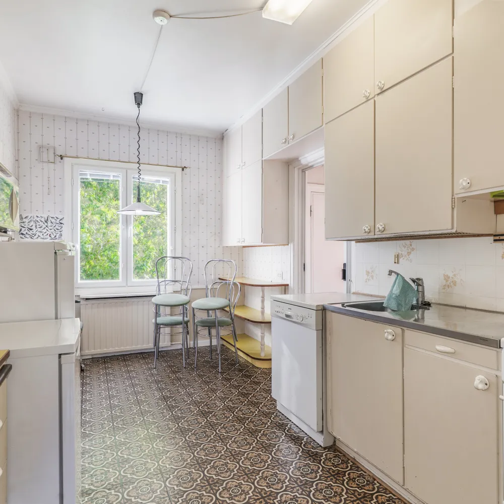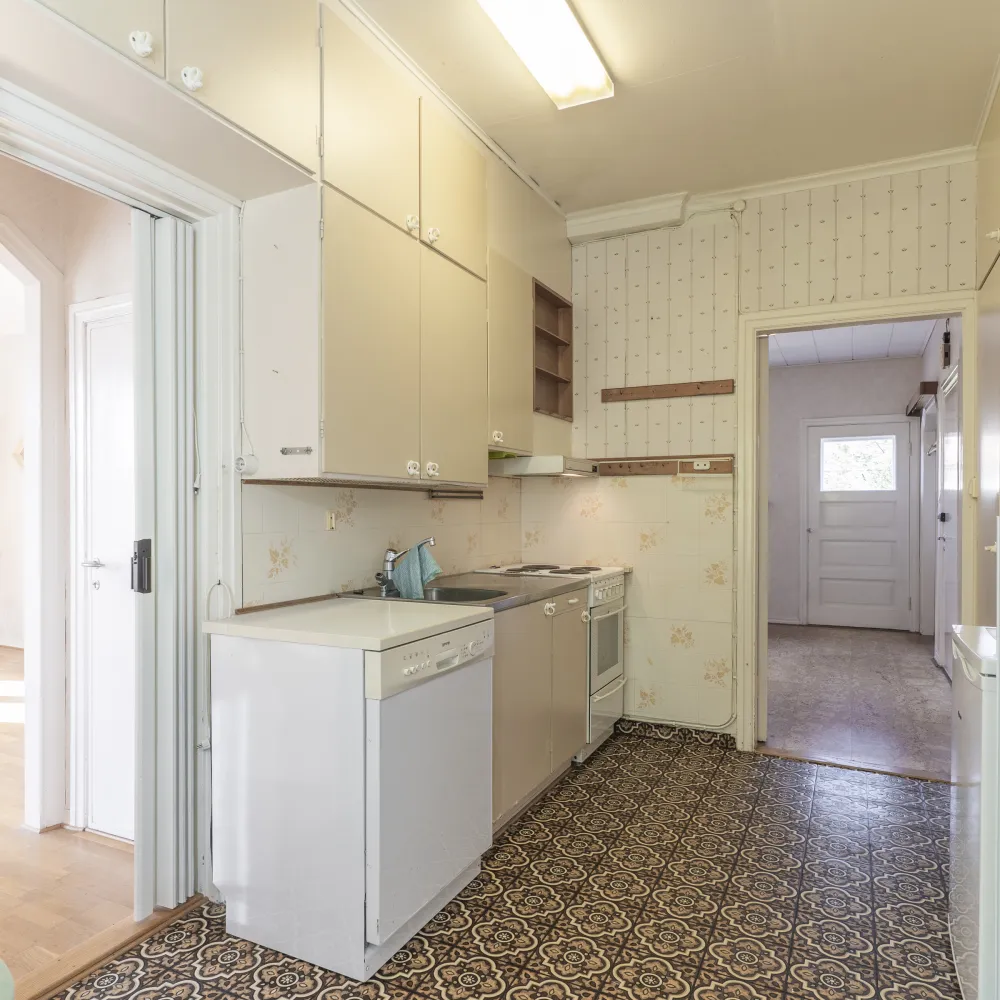 Lägenheten har inte genomgått några renoveringar i modern tid varvid behovet av modernisering anses vara stort. De invändiga ytskikten utgörs i bostadsutrymmena huvudsakligen av parkettgolv/plastmatta och tapetserade/målade väggar.