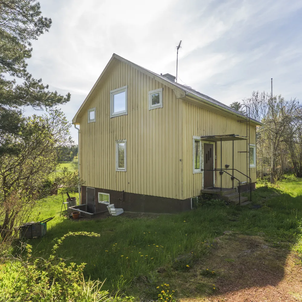 Bostadshuset är uppfört 1954 i ett och halvt plan i liggande stock, murad/gjuten källarvåning under huset. Yttertaket är ett äldre plåttak och fasaderna är utav stående träpanel.
