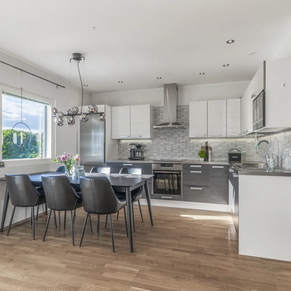 Kök och vardagsrum ligger i en ljus och öppen planlösning med stora fönster mot väster. Köket inrymmer gott om förvaring i Puustelli skåpinredning samt vitvaror från Siemens utgörande kyl/frys, ugn, induktionshäll, fläkt samt diskmaskin vilken är integrerad i skåpinredningen. Bänkskivorna är laminerade och stänkskydd är kaklat.