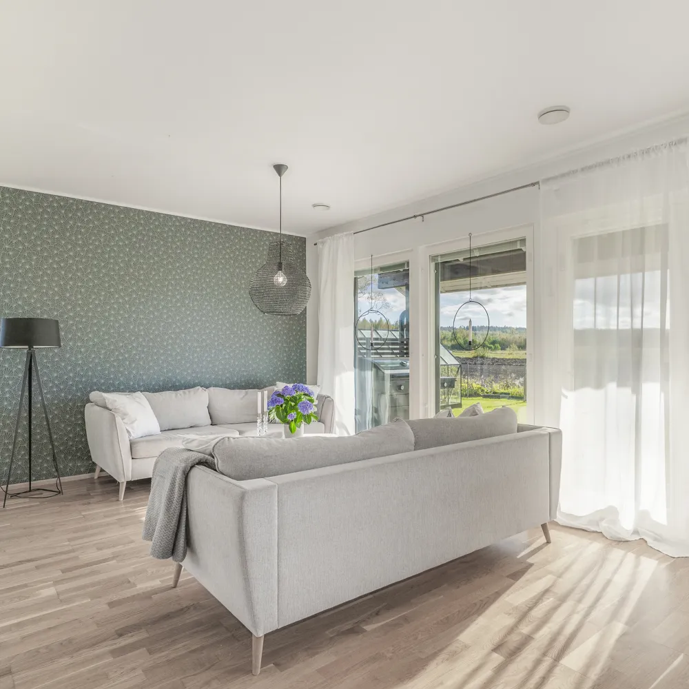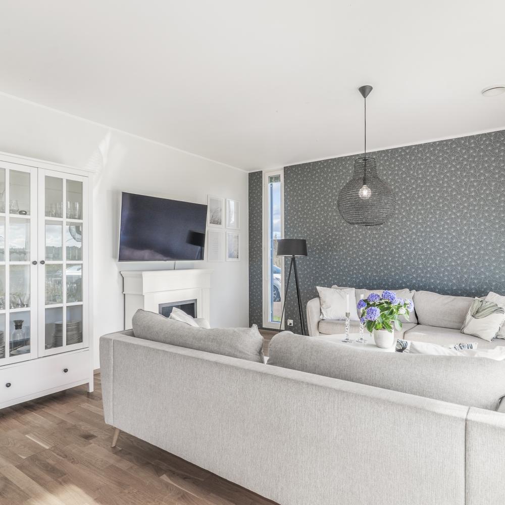 Vardagsrummet inrymmer plats för soffgrupp och tv-möblemang. Här finns även access till uteplats samt trädgård i västerläge.